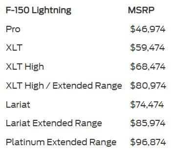 The bad news doesn’t end there as the XLT trim climbs from $52,974 to $59,474 for an increase of $6,500. Continuing up the trim ladder, the XLT High now starts at $68,474 and climbs to $80,974 with the Extended Range battery. The Lariat will set you back $74,474 or $85,974 with the Extended Range battery. Lastly, the range-topping Platinum Extended Range will now retail for $96,874.