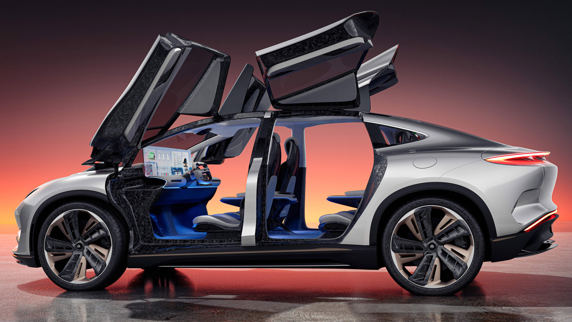 The upwards-opening doors of the unconventionally-proportioned SUV (front scissor doors and rear gullwing doors) provide access to the roomy cabin which has “home theater, meeting room, and lounge” configurations.