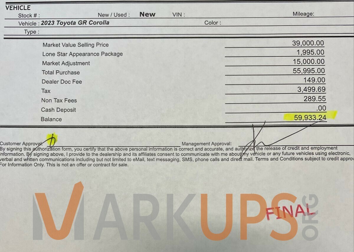 First up is Lone Star Toyota of Lewisville. According to a user over on Markups.org, the dealer sent him the sheet seen below with a grand total price on a base GR Corolla of $59,993. To get to that figure the dealer has the audacity to charge $15,000 in pure markup in addition to a $1,995 “Lone Star Appearance Package”. If I were tricked into buying this car the last thing I’d want to do is advertise for the shady dealer that raked me over the coals in the process.