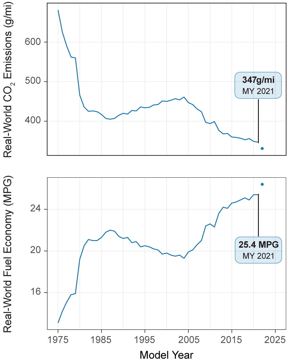 There has, however, been important progress over the last 18 years. The EPA reports that since the 2004 model year, CO2 emissions have fallen by 25 percent (from 461 g/mile to 347 g/mile), while average fuel economy has improved by 32 percent, or 6.1 MPG.