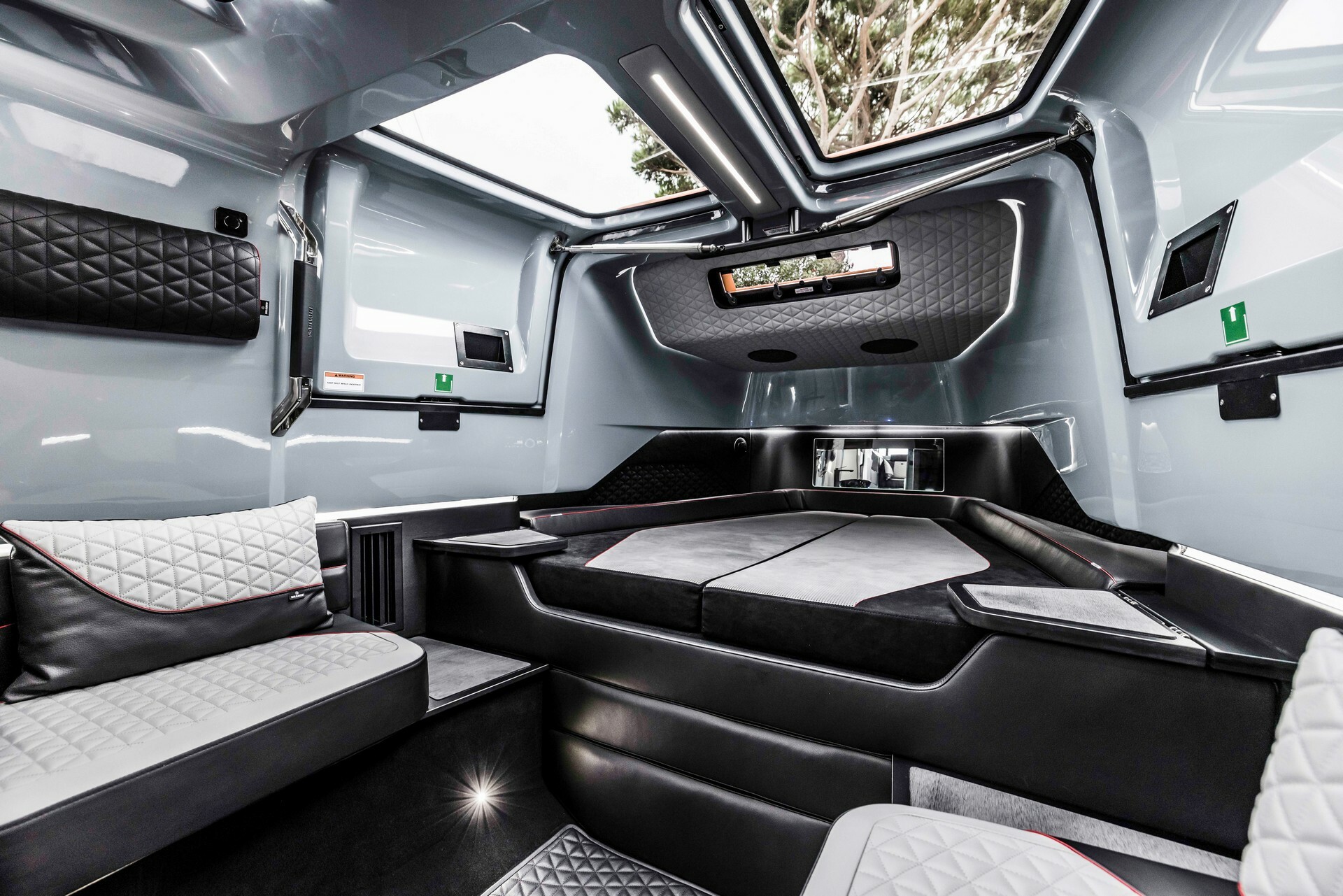 Plenty of features are also found in the cabin of the new Brabus, all of which are within reach of the driver. It includes a pair of high-definition system displays with an updated Brabus UI, G-shock monitoring, navigation controls, engine management, onboard entertainment features, and access to various assistance features. An Extended Navigation system is also available that adds two 9-inch screens, a 4G mobile WiFi router, a VHF unit with an AIS receiver, a Halo20+ radar, and a 5-inch touchscreen for the front lounge area.