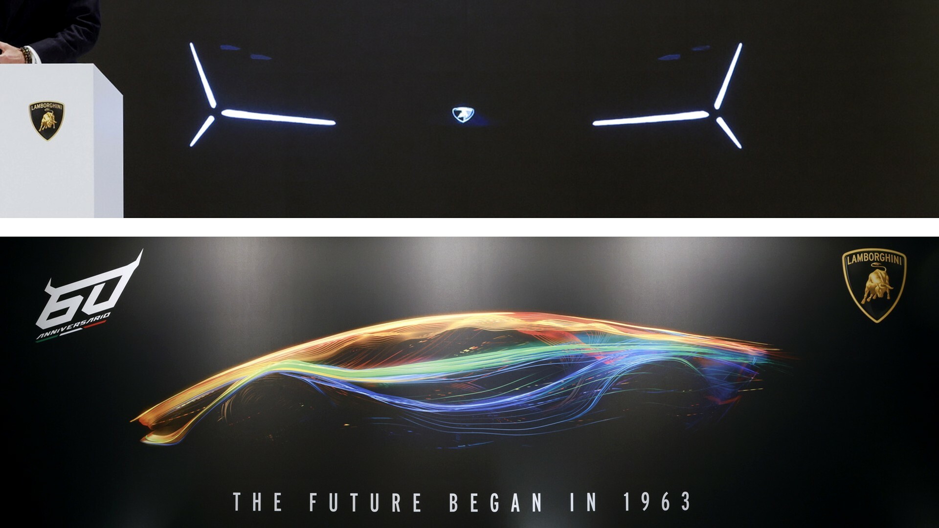 Those words likely hint at a few new model launches, including the much-anticipated debut of the all-new V12 flagship set to replace the discontinued Aventador. While we were initially hyped up about a potential teaser, a closer look reveals that the printed image behind Winkelmann shows the LED headlights of the 2017 Lamborghini Terzo Millennio concept. As for the profile sketch in the entrance, this is probably a combination of lines from many different Lamborghini supercars rather than a teaser for the new model.