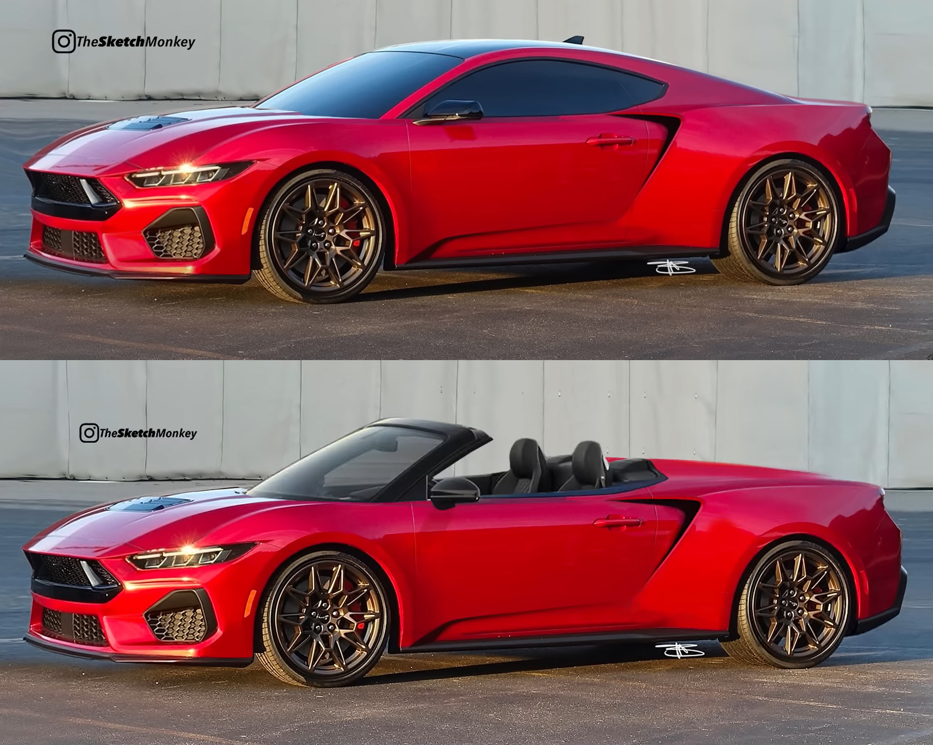 Overall, the rendering is a home run in our eyes, and we could envision it out on the roads in the extremely unlikely event that a project like this was ever greenlit. As for a potential powertrain, we could see it using the Dark Horse‘s 5.0L V8 with 500 hp (507 PS / 373 kW) and 418 lb-ft (567 Nm) of torque, which would put it in line with the C8 Stingray’s 495 hp (502 PS / 369 kW) and 465 lb-ft (630 Nm) of torque. TheSketchMonkey even made a convertible version too, and we’d recommend checking that out, as well as the car’s full design process, in the video above.
