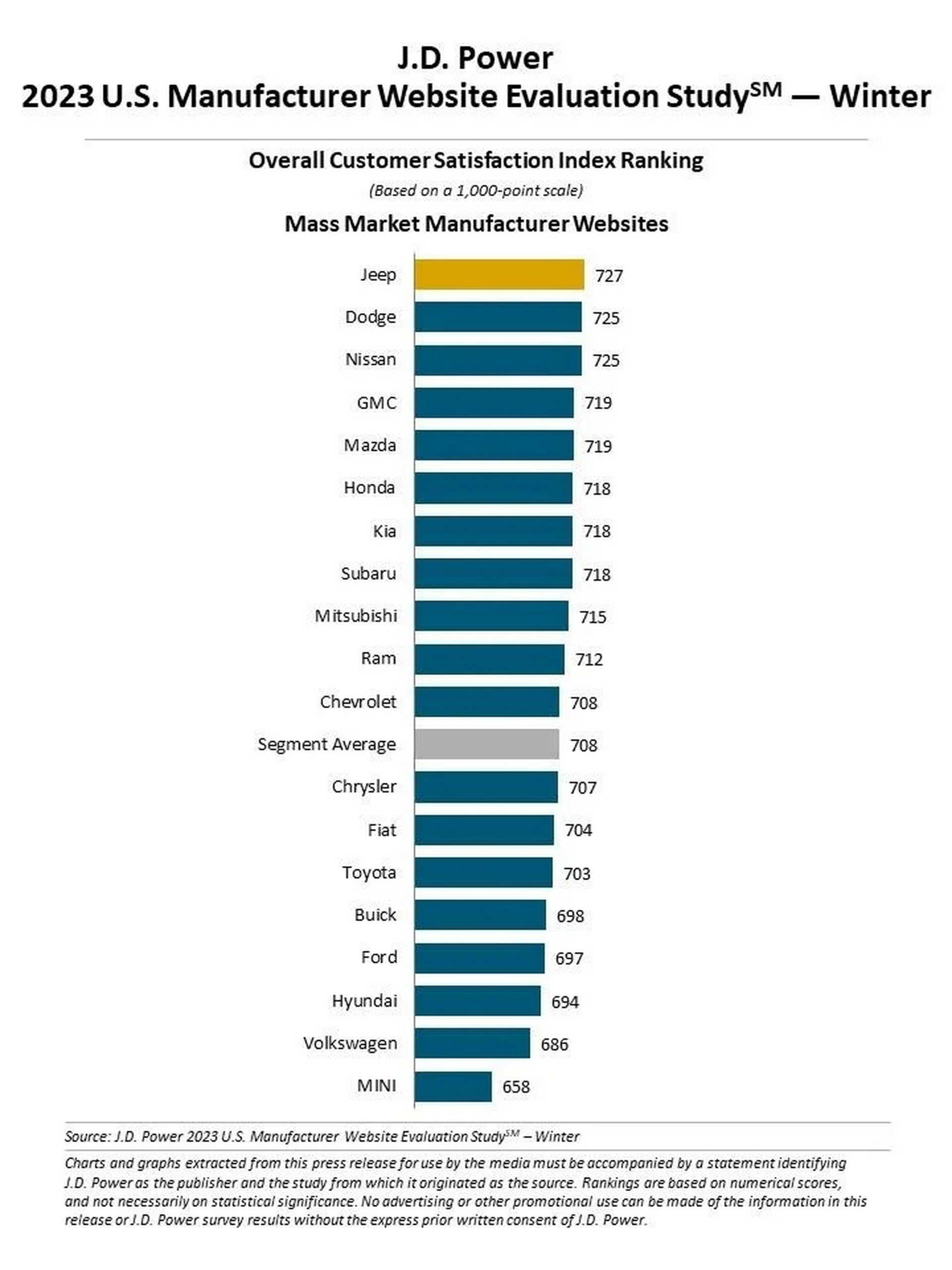 Jeep, meanwhile, scored 727 out of 1,000, while Land Rover was the best performing brand overall, with a score of 749. And that matters not only because a manufacturer’s homepage is often a potential customer’s first point of interaction with the brand, but because a good website can increase sales, too.