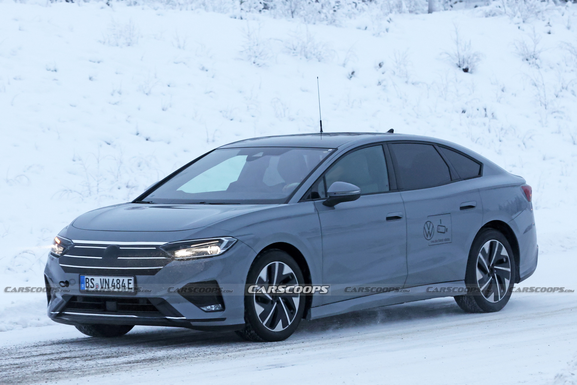 A few hours after Volkswagen previewed its first fully electric sedan with a special camouflage wrap at CES, Las Vegas, our spy photographers nabbed a new prototype of the VW ID.7 during winter testing in Europe.