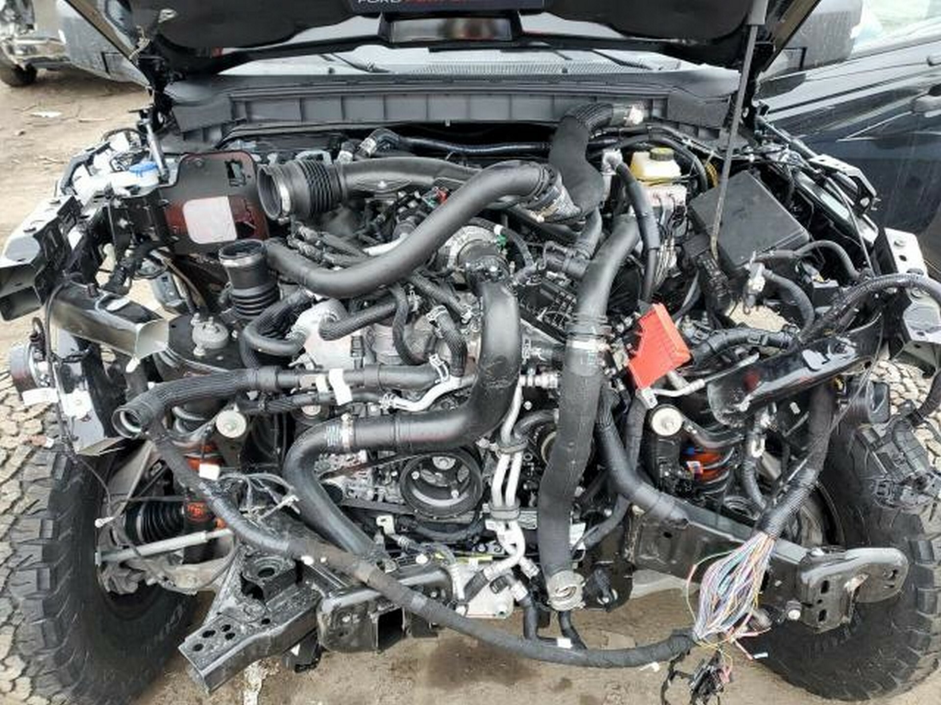 We can see that some serious damage has been done to the front crash structure of the Ford. Additionally, the radiator is missing completely and there are a bunch of hoses and pipes hanging loose. Interestingly, the listing states that the Bronco Raptor can run and drive, meaning that while the engine isn’t very nice to look at, it is still operational. With some repairs and a new radiator, it could conceivably run as good as new.