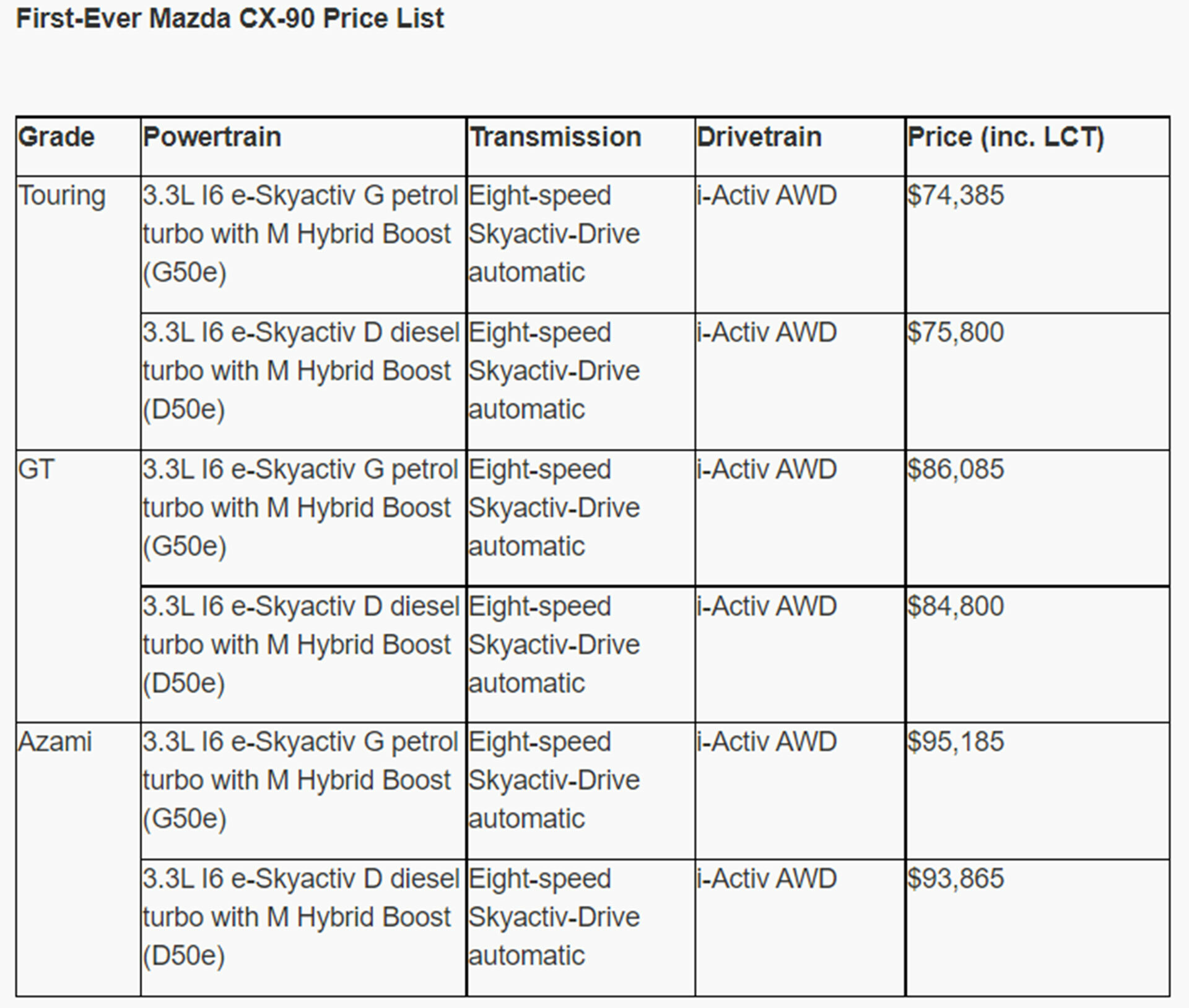 As in the U.S., consumers in Australia will have two powertrains to choose from. The first is a 3.3-liter turbocharged inline-six diesel with M Hybrid Boost 48-volt mild hybrid technology and producing a combined 187 kW (251 hp) at 3,750 rpm and 550 Nm (406 lb-ft) of torque between 1,500 and 2,400 rpm. Those seeking more power can order the CX-90 with a 3.3-liter turbocharged inline-six petrol with the same mild hybrid technology and rated at 254 kW (340 hp) and 500 Nm (369 lb-ft) of torque.