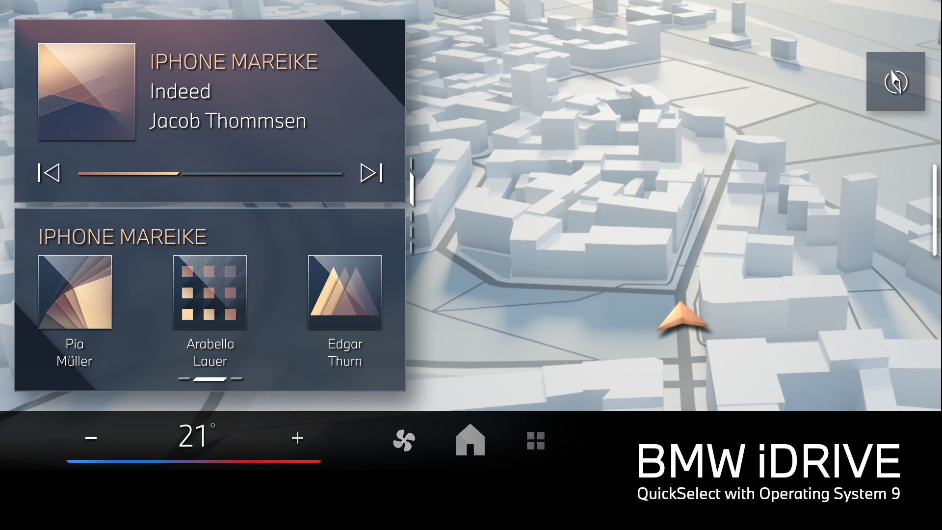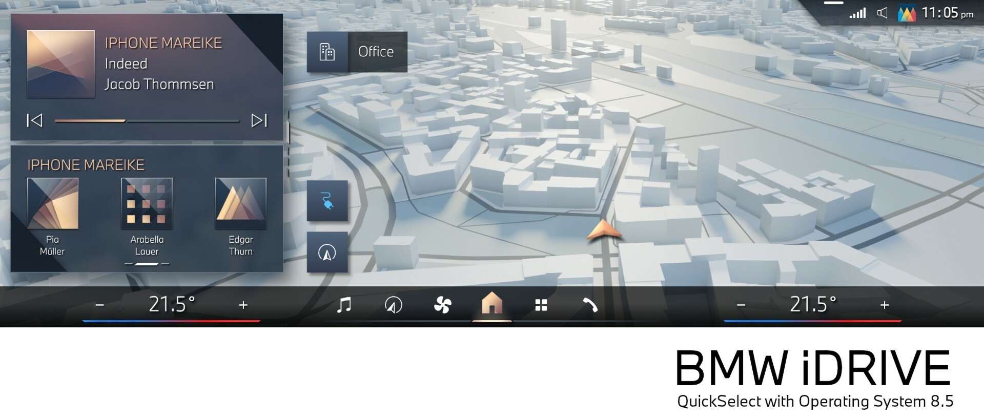 The highlight of the OS 8.5 is the revised home screen with the QuickSelect feature and a flat menu structure where all functions are visible through shortcuts and live widgets. Inspired by smartphones, BMW designers got rid of sub-menus and adopted a zero-layer principle so it is easier for the driver to access the desired functionality. Of course, the interface is configurable and can display different kinds of graphics in place of the standard navigation map.