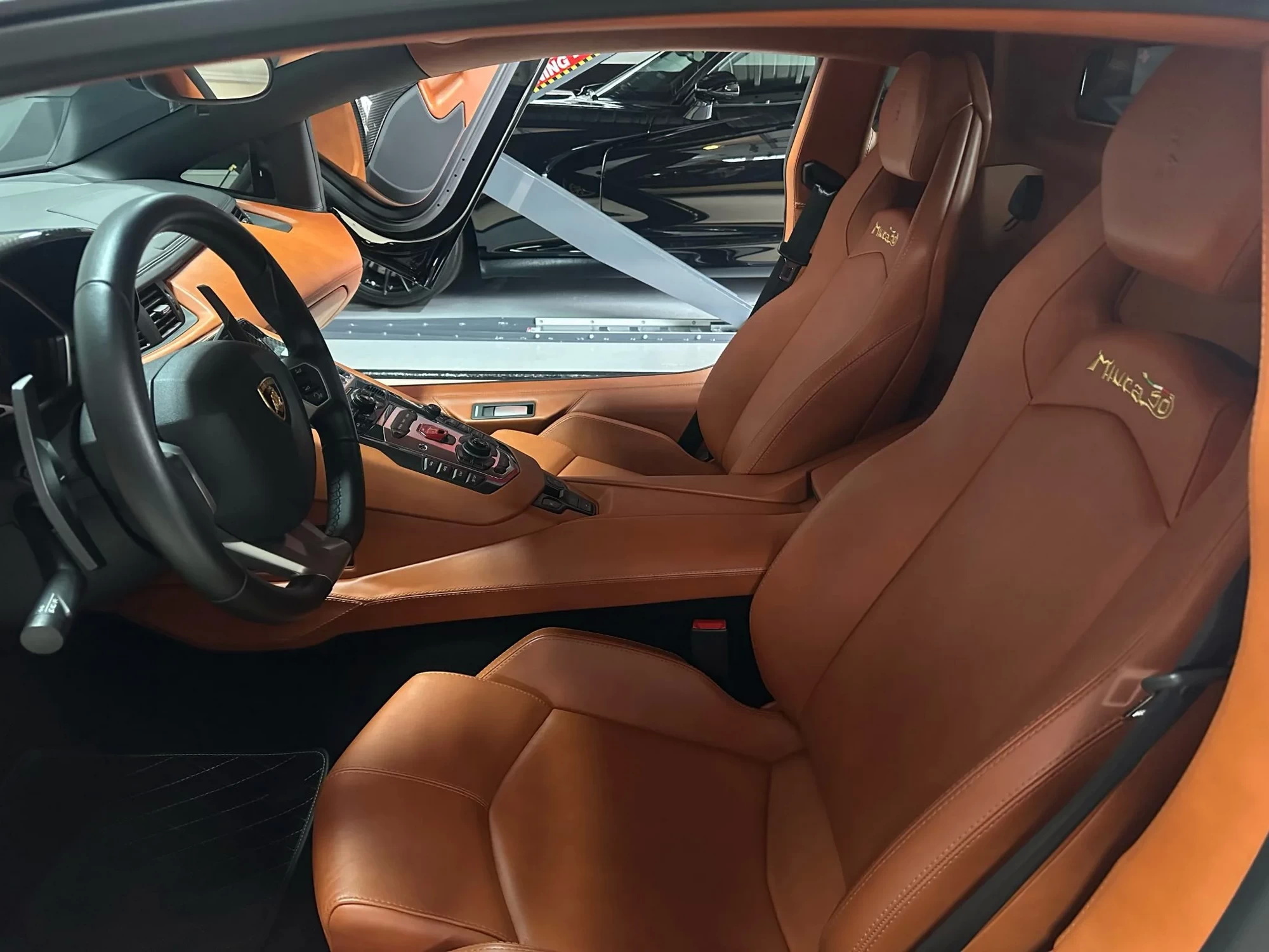 Inside, the car features all of the tech you could want from a Lamborghini, including heated, power-adjustable seats, trimmed in Terra Emilia leather which feature “Miura 50” embroidery in the seatbacks.