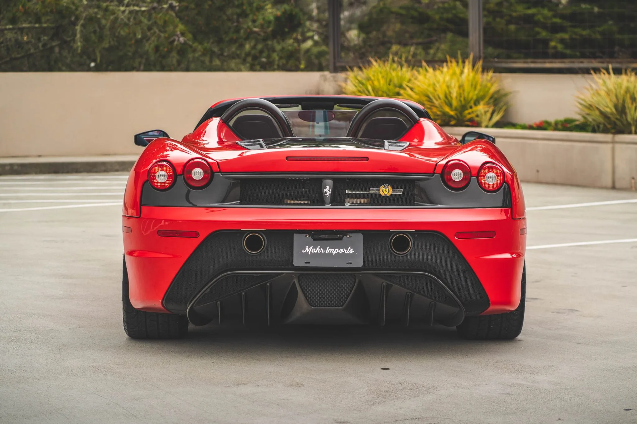 Like most other 16M Scuderia Spiders, this one is painted in Rosso Corsa and sits on 19-inch alloy wheels with a gray finish and wrapped in 235/35 front and 285/35 rear Pirelli P Zero Corsa tires. It also features a Tricolore hood strip and has carbon fiber across parts of the front fascia, the rear grille surround, and the aggressive rear diffuser.