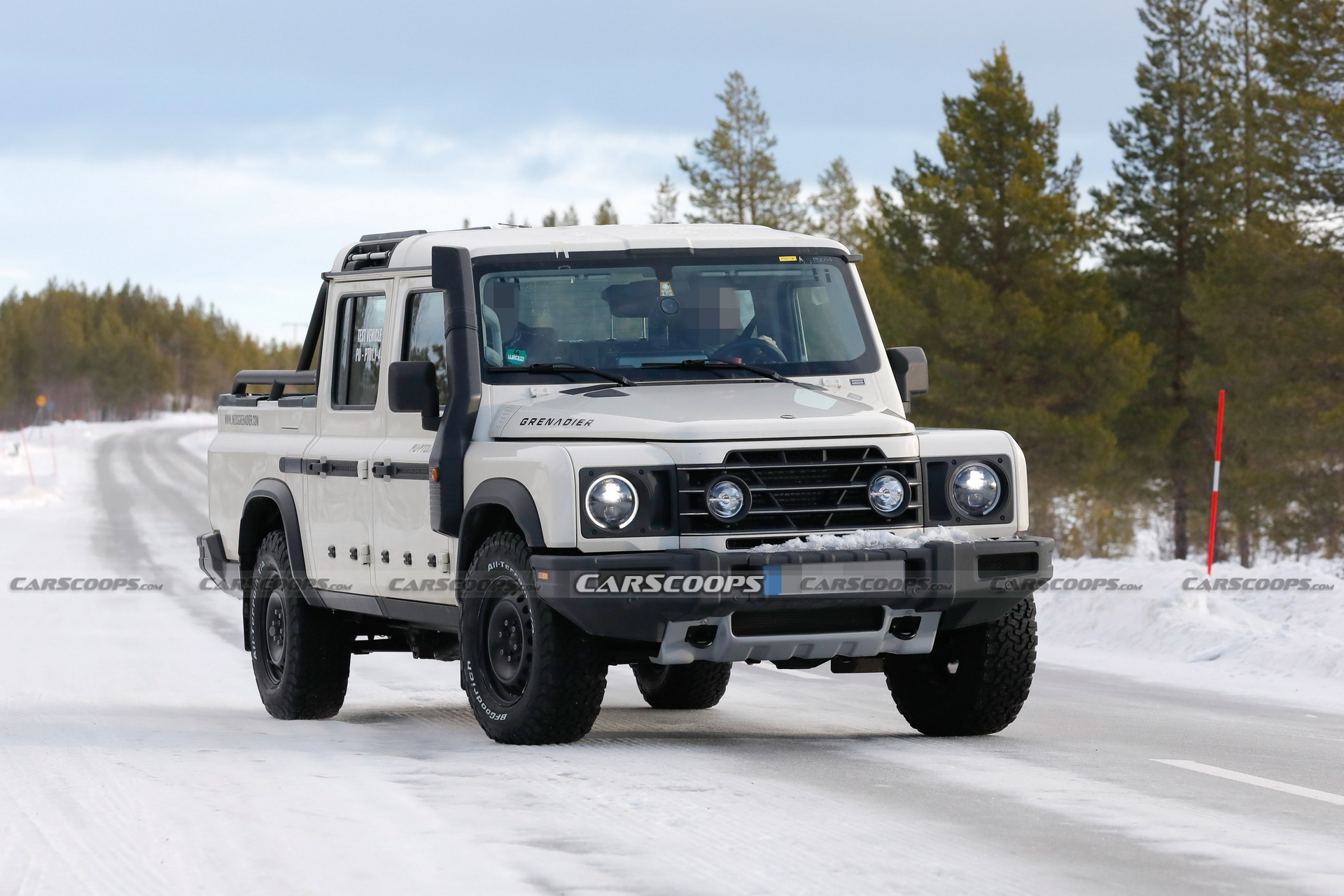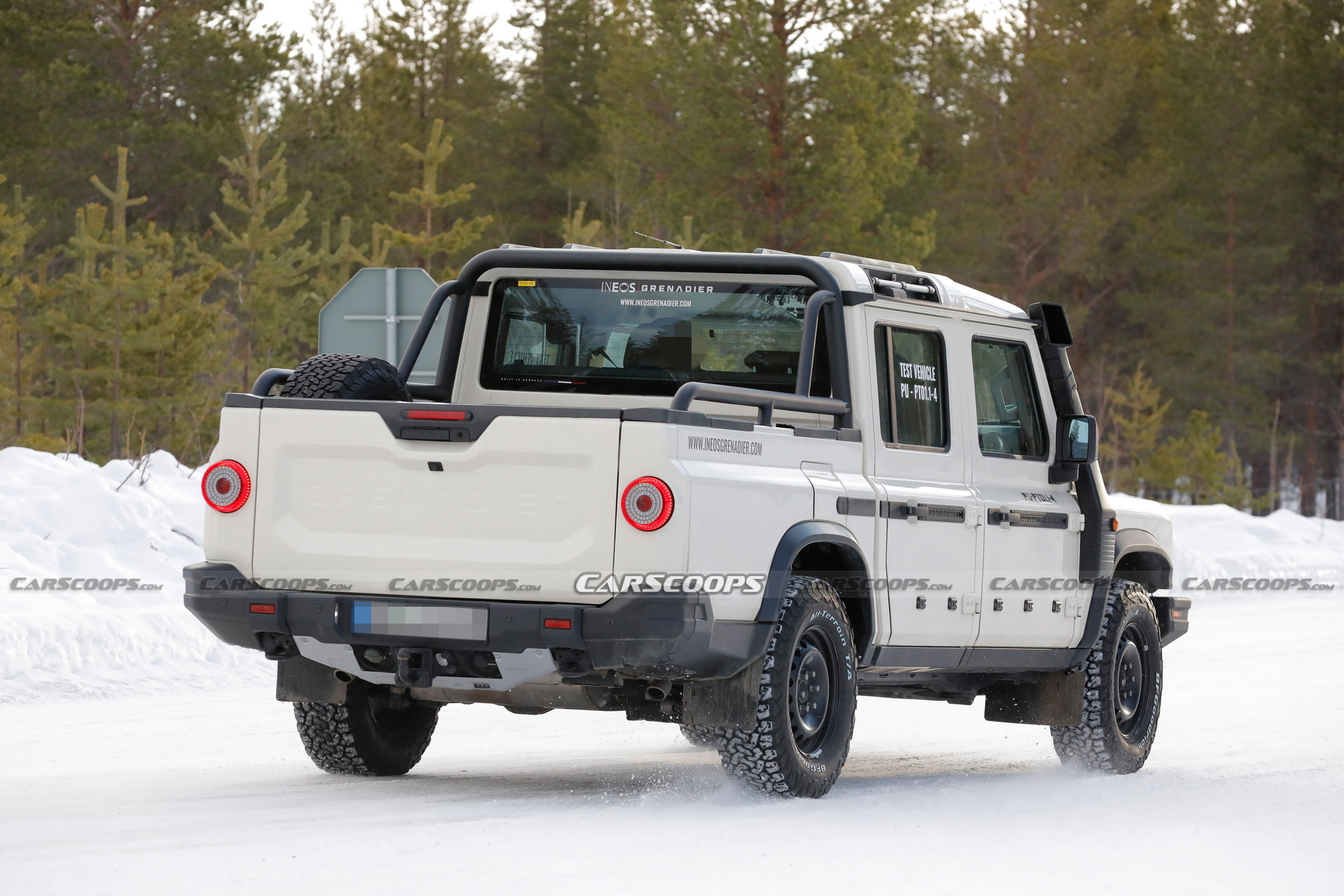 Predictably, the entire section up to the B-pillars is shared with the Ineos Grenadier SUV, but the wheelbase has been stretched and the rear overhang is significantly longer to make room for a large rear bed. The prototypes came fitted with grippy all/terrain tires, mudflaps, a snorkel, and a tube frame for the rear bed which also houses the spare wheel.