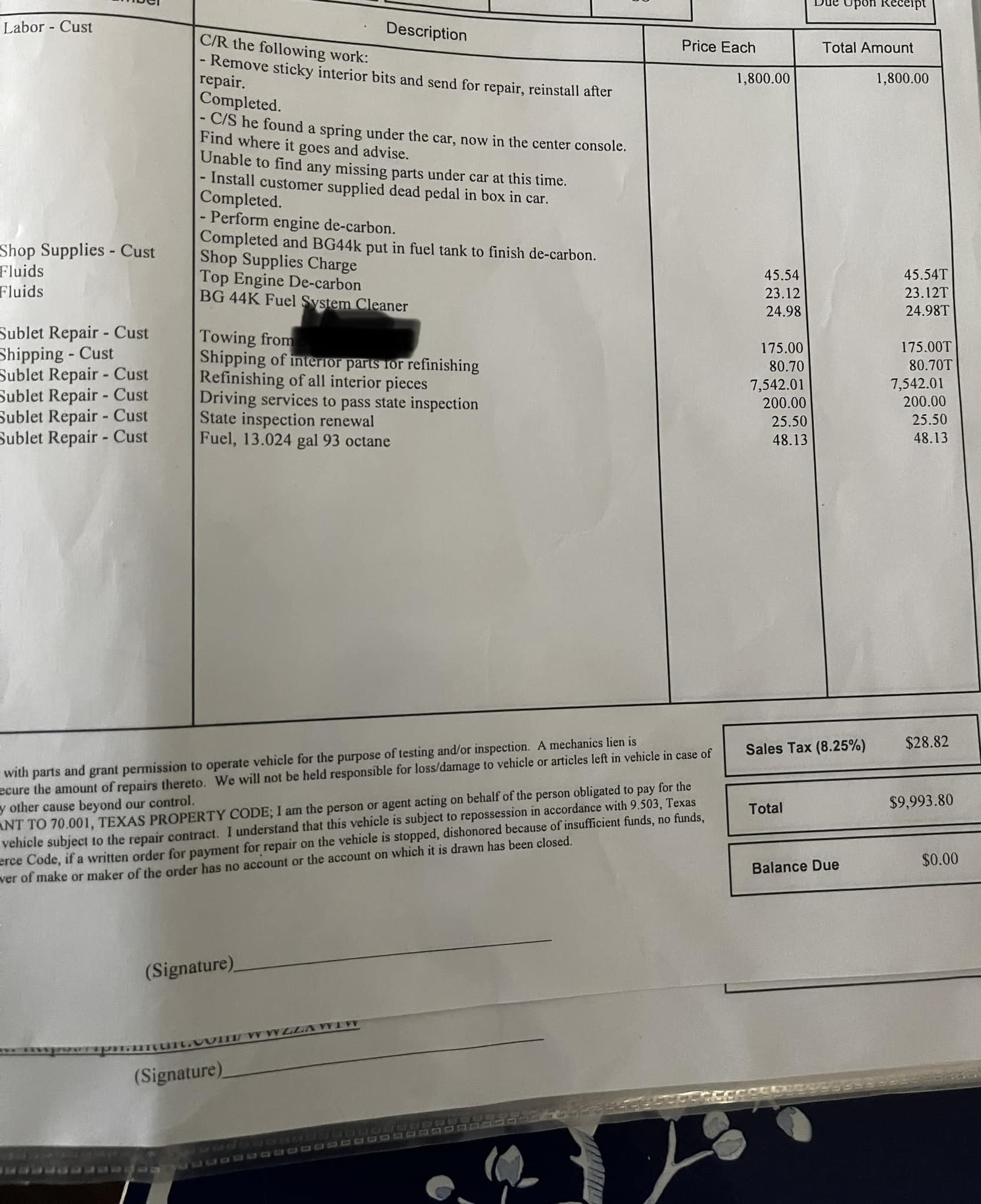 Notably, the service record shows just $7,542 for the “refinishing of all interior pieces” but there are other charges of $80.70 for “shipping of interior parts for refinishing” and $1,800 for all of the associated labor with the visit. Some of that labor centered around an engine carbon cleaning, installing a dead pedal, and other things but the buttons were the top issue raised.