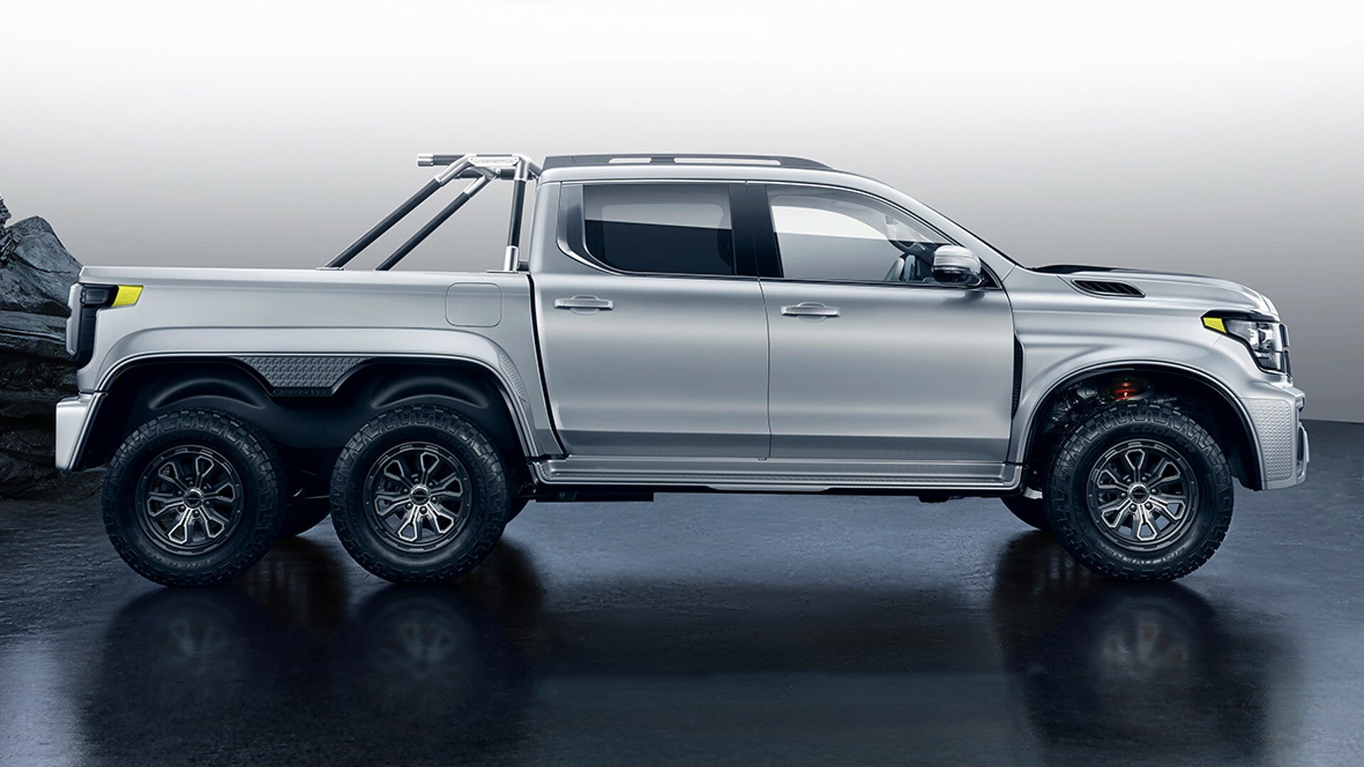 The CyberP!ckup is powered by a plug-in-hybrid twin-turbo 3.0-liter engine producing 510 hp (380 kW / 517 PS) and 750 Nm (553 Nm) of torque. Power is transmitted to all six wheels with five locking differentials. While a heavyweight six-wheeler is not the most efficient form of transportation, the electrified powertrain will also allow at least some zero-emission driving range – even though it will be greatly reduced compared to the regular four-wheeler version.