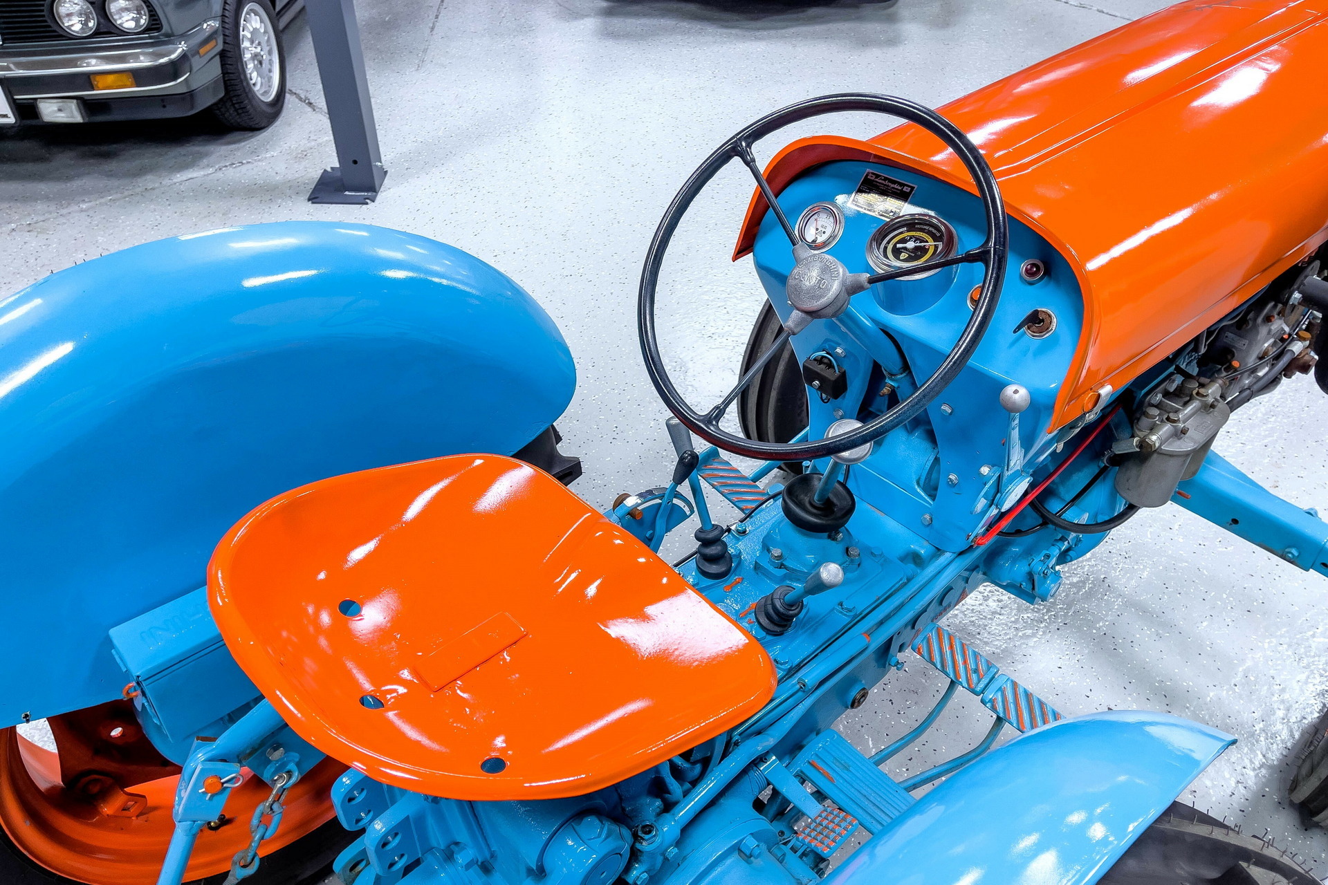 Going back to this 2R, it features a 2,193cc 3-cylinder engine making all of 39 hp (40 PS / 29 kW), which is mated to a four-speed manual transmission. It was imported from Italy in 2022, but a year before, it underwent a comprehensive restoration in which it was completely disassembled, sanded down to the frame, then refinished in the same blue and orange color scheme it originally wore. Along with the visual restoration, the tractor also received new fuel pumps, a new hydraulic hitch assembly, and a service to its PTOs, and as a result, it actually runs and drives.