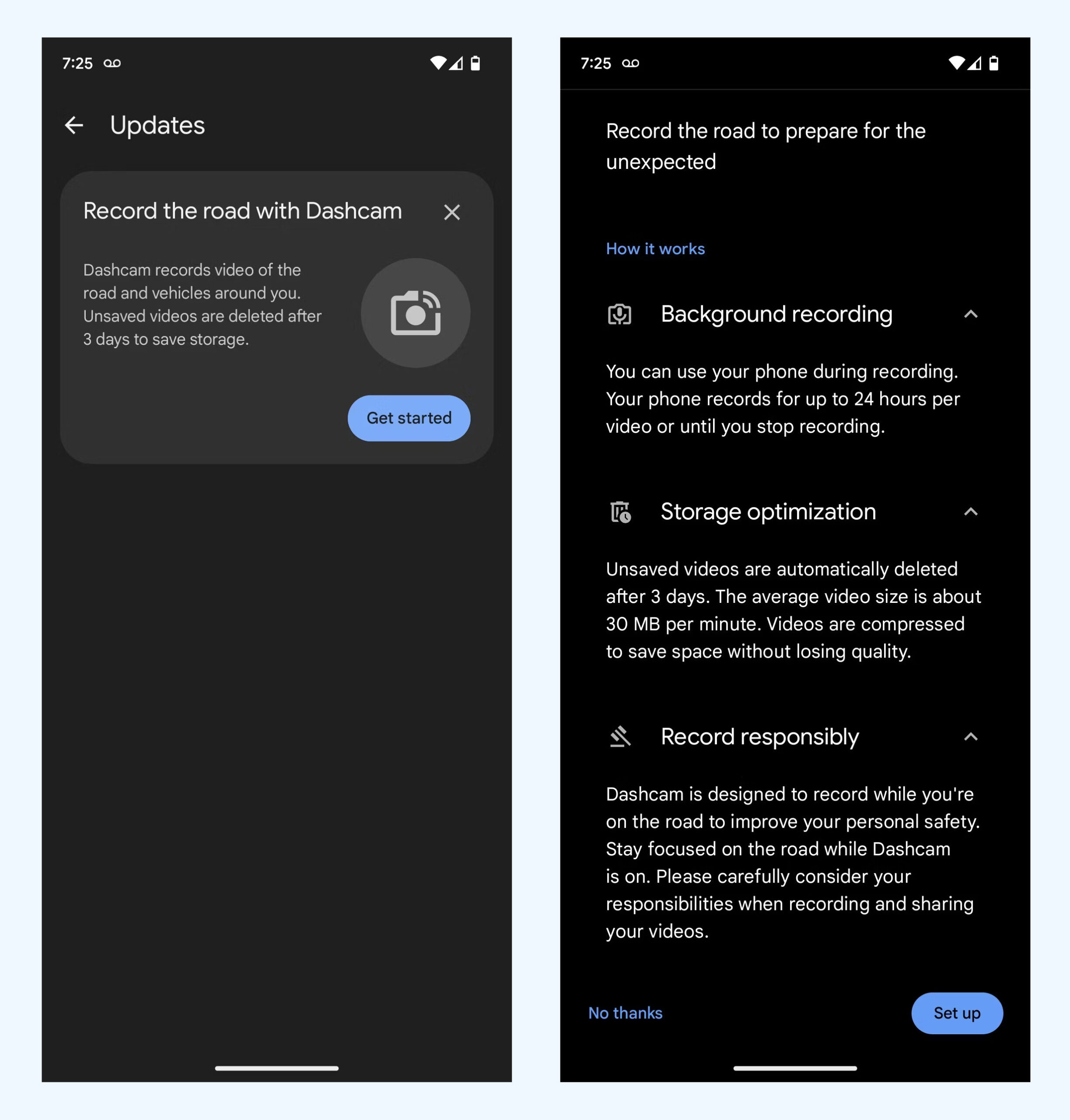 The pre-release feature was simply called “Dashcam,” and did what the discoverers expected it to. Set it up on your dashboard, and it records video (and, optionally, audio) while you drive. Although that is by no means a new idea, it’s one that has historically required its own dedicated device.