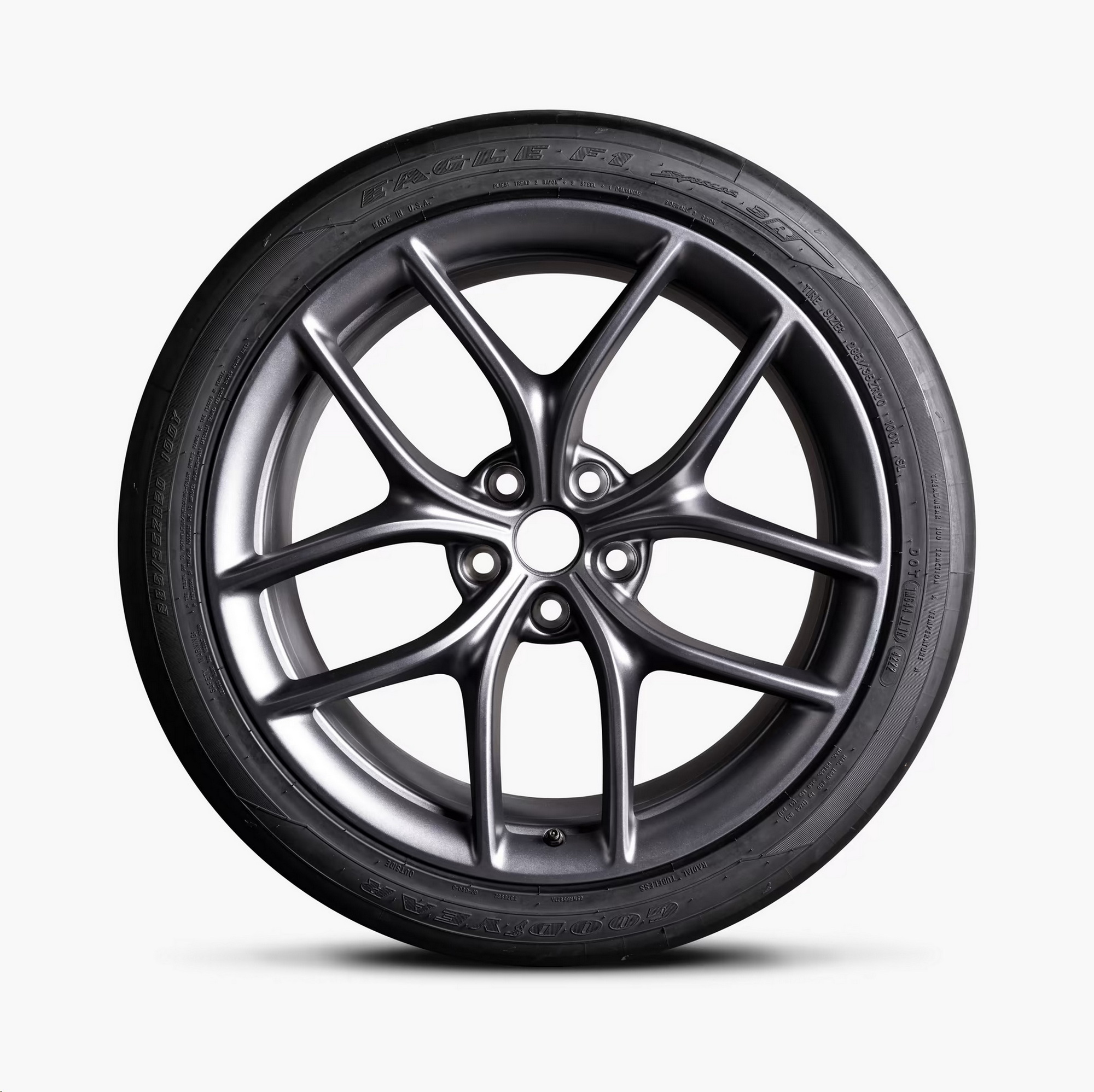 The Track Package also comes with 20-inch Zero-G wheels, including center caps, tire nut valves, and lug nut covers, wrapped in Goodyear Supercar 3R tires (285/35RR20 in the front, 305/30R20 in the back), which feature the Plaid logo on their surface.