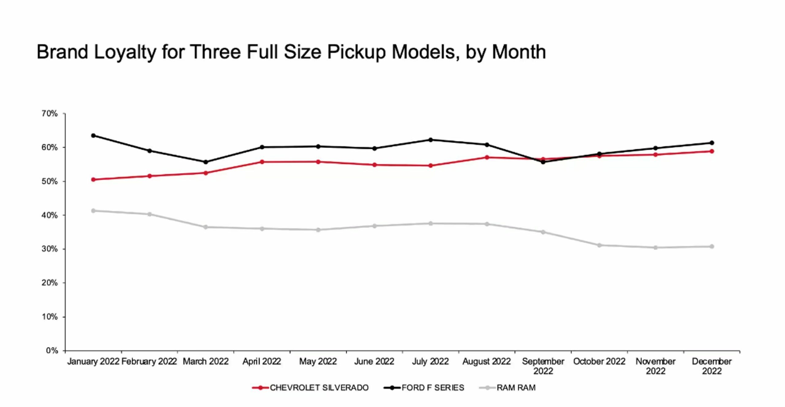 Ram does not enjoy the same level of loyalty among its light duty pickup customers, falling from 47.3% prior to the pandemic to just 36% in 2022.