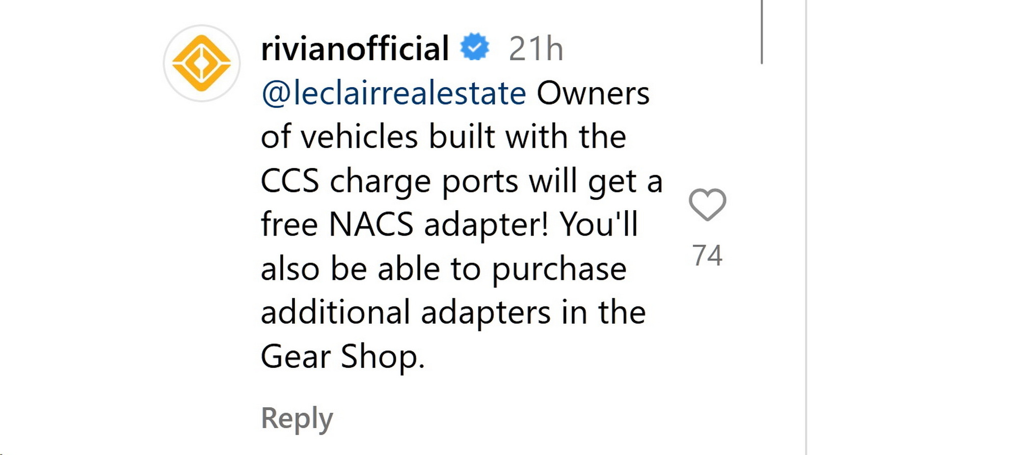 Rivian made the announcement that it will be joining the NACS charge port standard in the near future on Instagram yesterday, and was asked about what would happen for “current owners” by user @leclairrealestate.