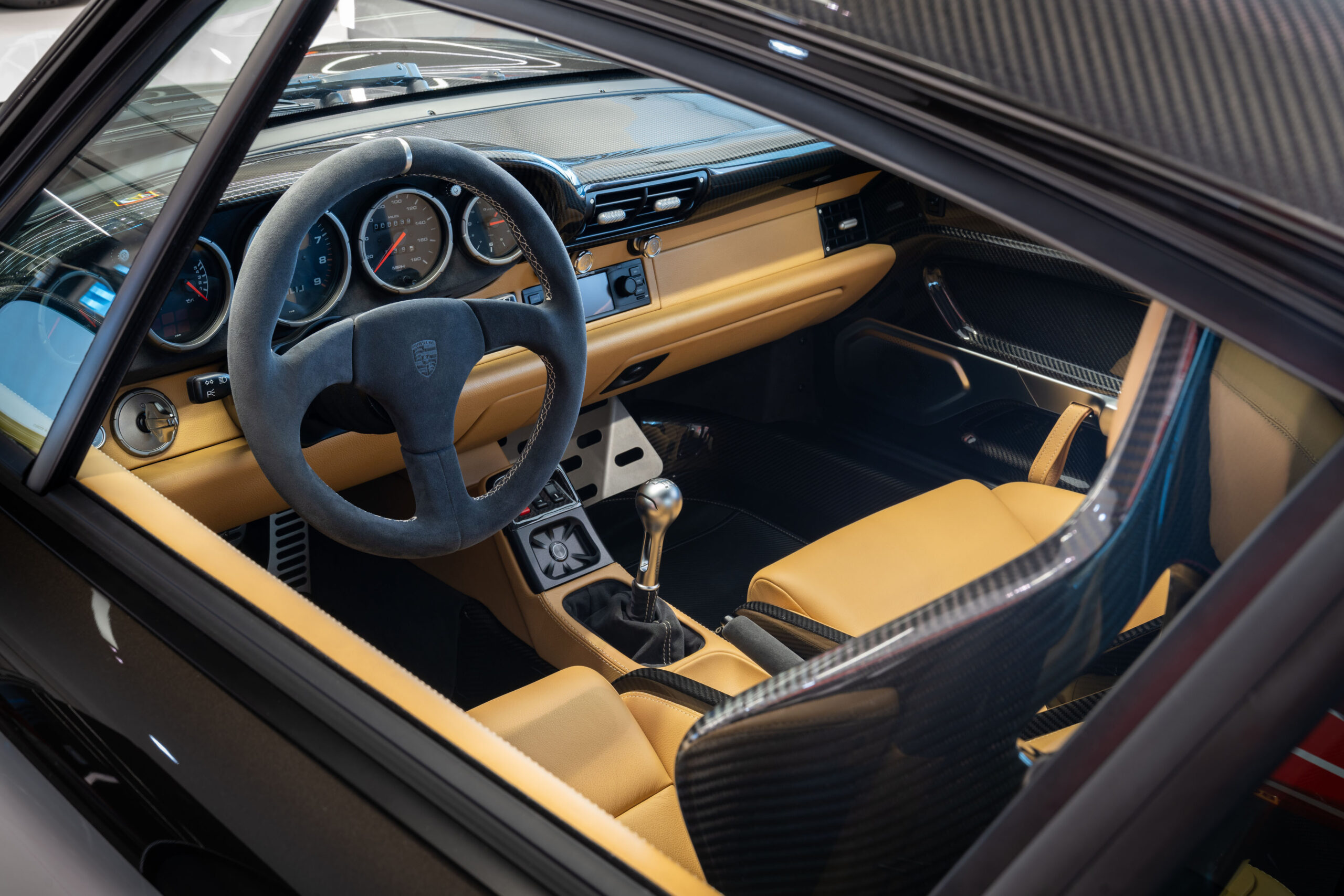 Under the rear decklid you’ll find more leather along with that 4.0-liter engine. It started life as a new 3.6-liter flat six but then spent time at Rothsport Road and Race in Sherwood, Oregon. By the time that builder is done, the engine features forged internals and, of course, more displacement. It also benefits from a custom intake plenum based on that of the 996-generation of the 911 GT3.