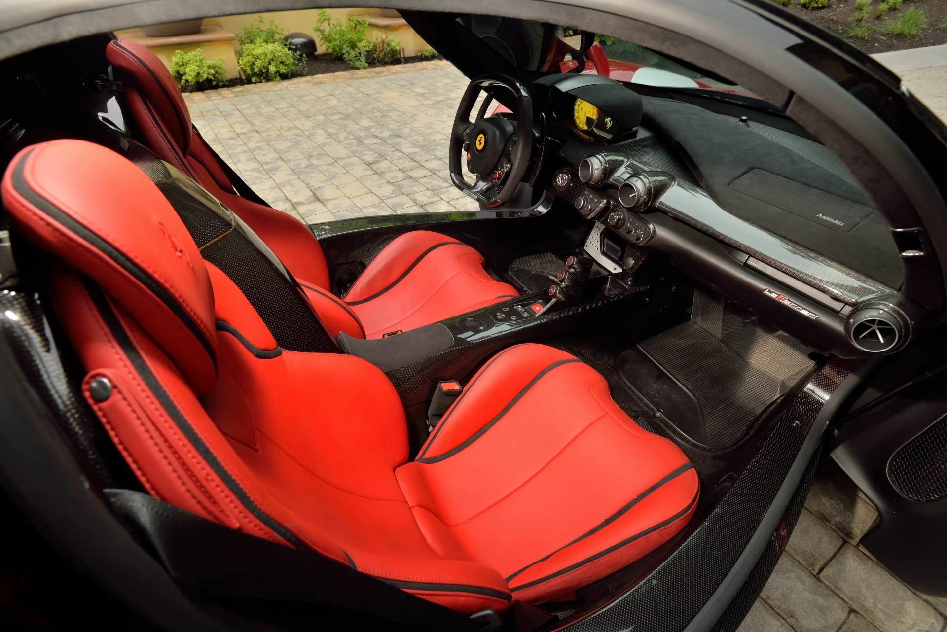 The unique exterior of the car is painted primarily in Rosso Corsa with matte black parts including the front bumper and the expansive rear clamshell. It then has white vinyl roundels on the sides and Pirelli graphics. It is rolling on staggered 19-inch front and 20-inch wheels with the front ones finished in silver and the rear wheels bathed in satin black. Unlike some other LaFerrari prototypes, this one also features all of the same active aerodynamics as the production model.