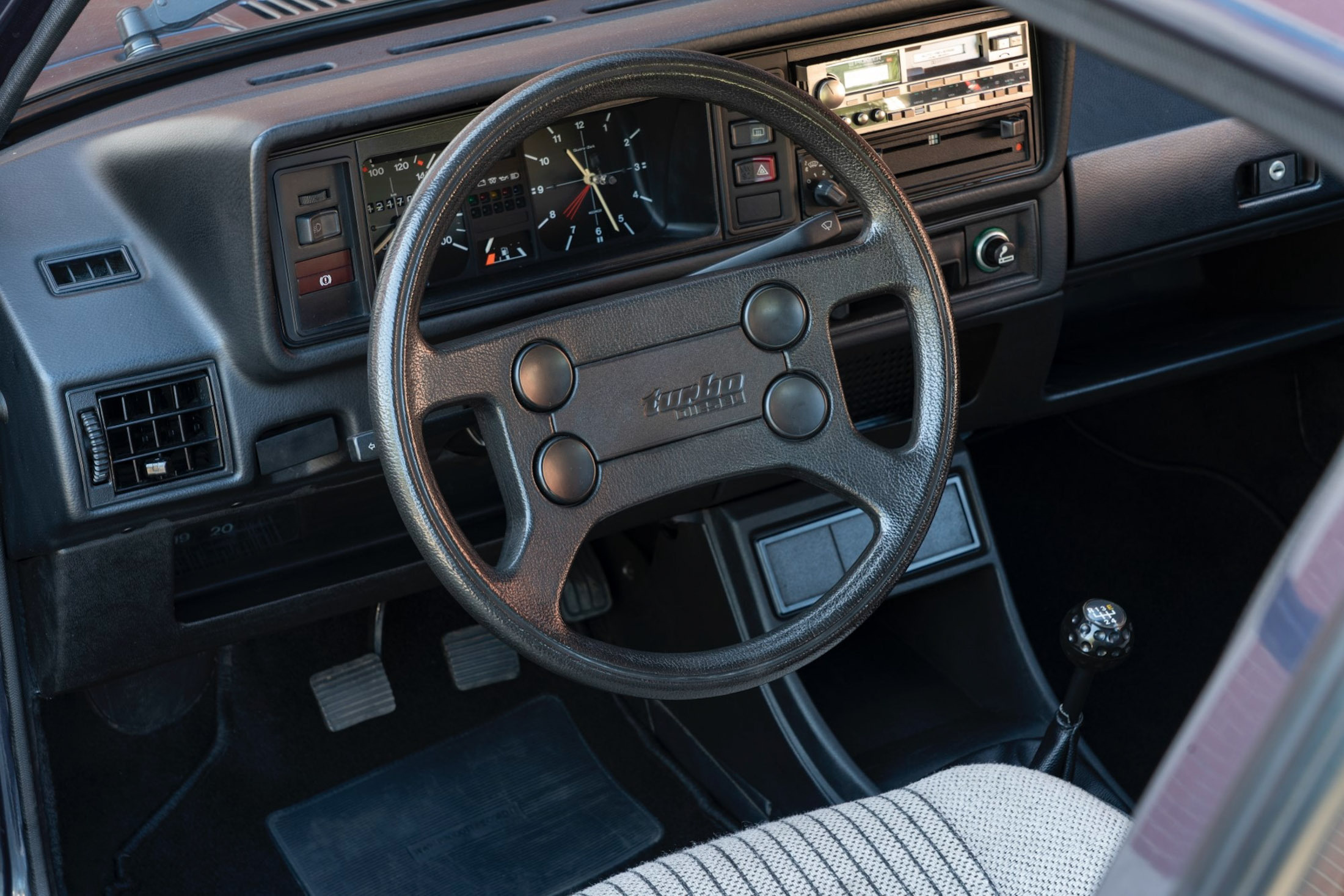 The GTD’s grille had a silver, rather than red pinstripe, and the GTI refused to share its sports seats and rev counter, but the arch spats, chin spoiler, blacked-out rear window surround, wide wheels (GTI alloys were optional) and golf ball gear shifter were all present. The big difference, of course, was under the hood, something the ‘Turbo Diesel’ script on the four-spoke steering wheel was happy to shout about.