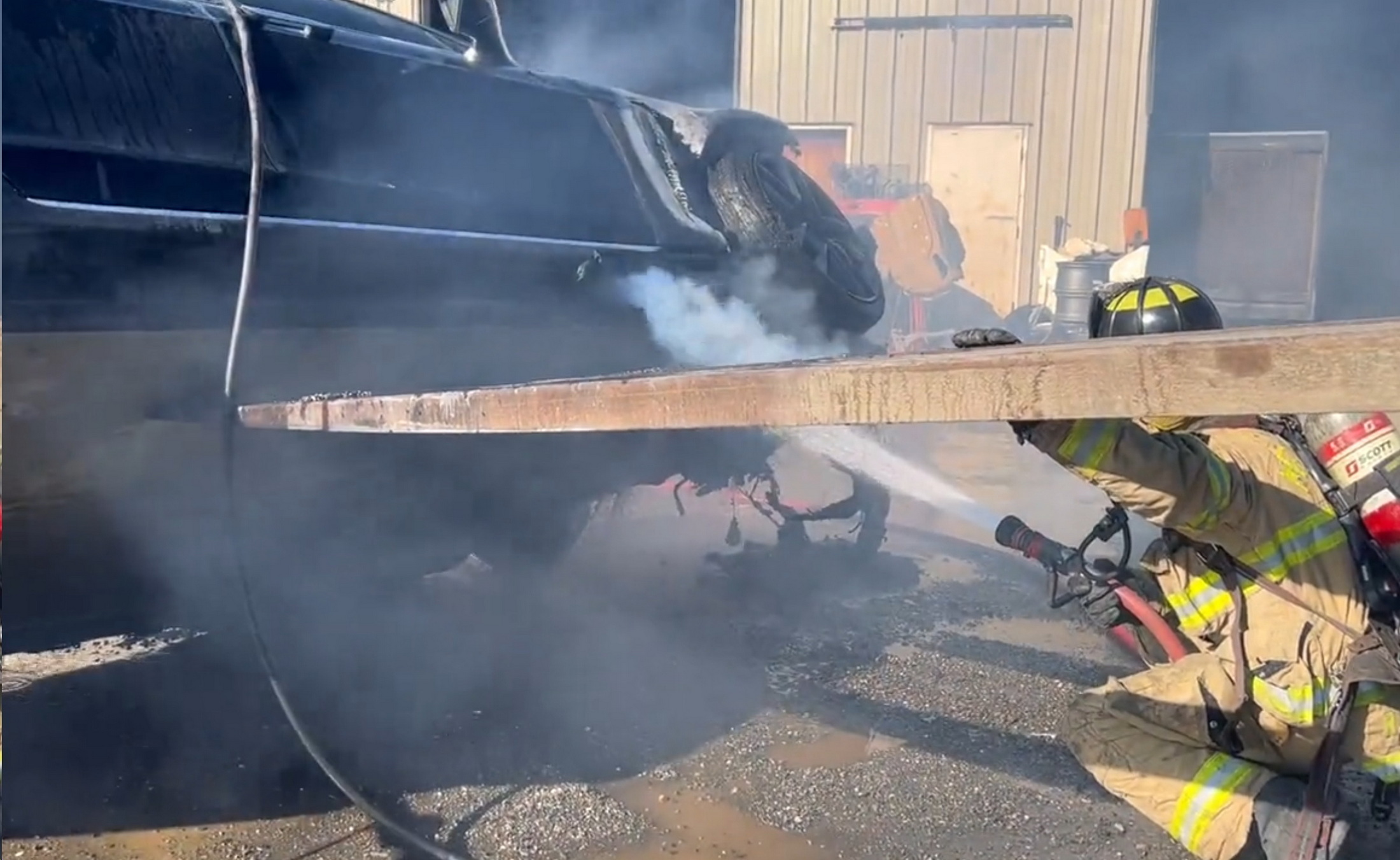 In this case, crews used a fork lift to expose the underside of the electric vehicle and allowing firefighters to spray the batteries with water. Beyond being inconvenient, the method also places the firefighter in close proximity to the smoke coming off the car, which can be toxic.