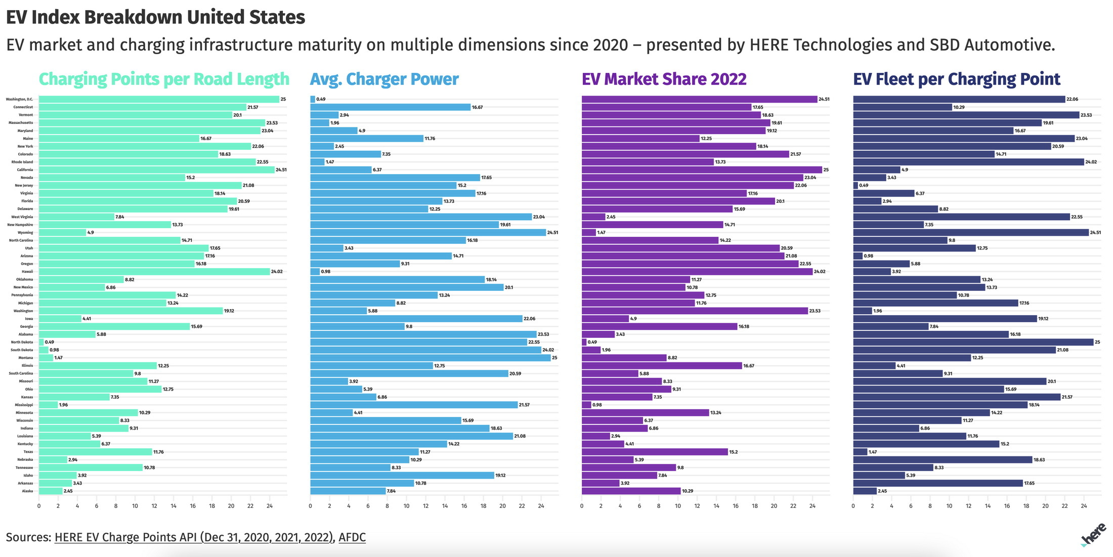 Just what is that happy ratio? According to new research from HERE and SBD, the average market should be looking to have one charging points for every eight to 12 electric vehicles on the road, but the real answer changes from state to state.