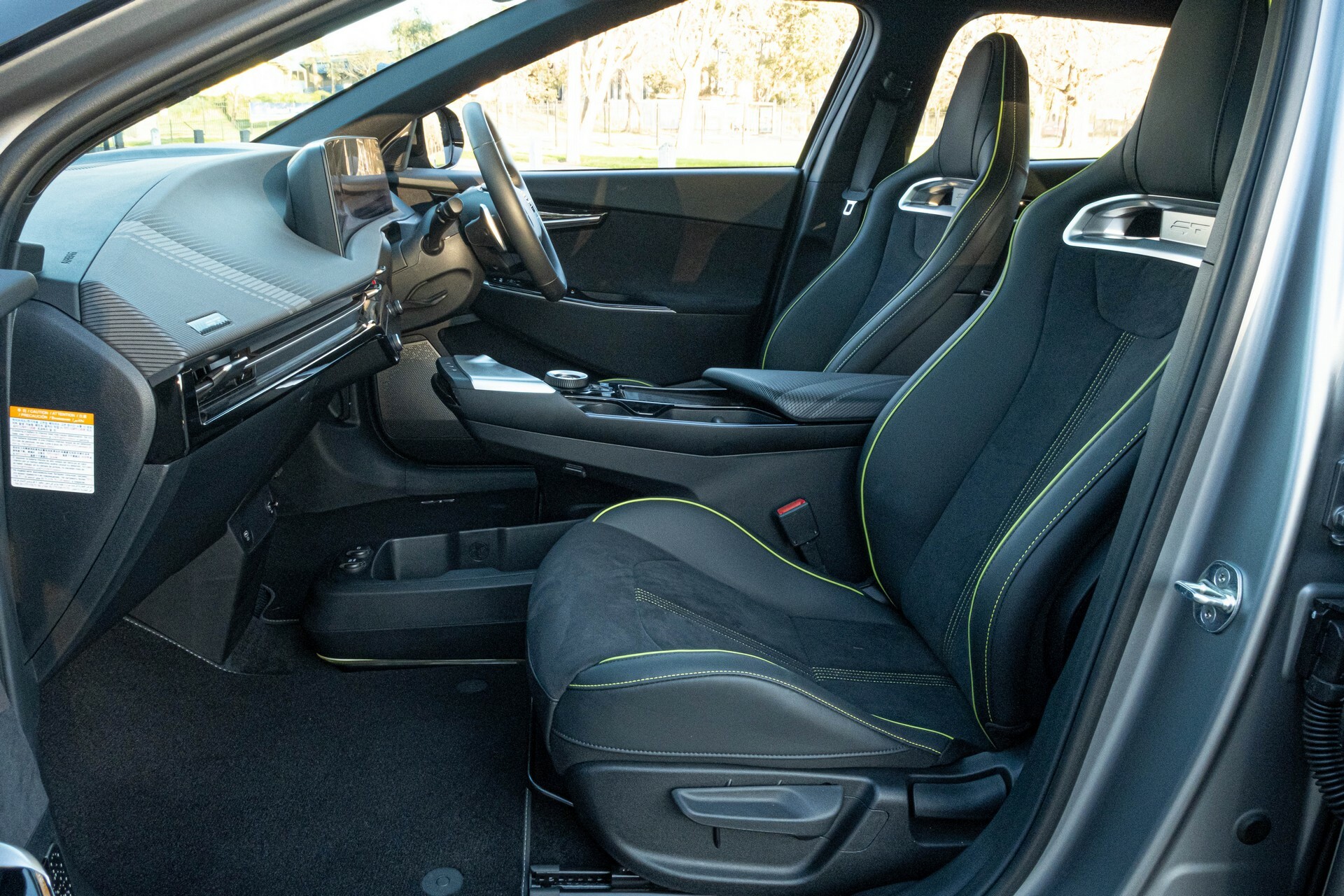 The cabin of the EV6 GT is a real highlight, even though some of the features surprised us a little when we first picked up the keys. The biggest differentiating feature between the EV6 GT and all other versions is the bucket seats up front. These seats look suspiciously like the ‘N Light Seats’ introduced for the Hyundai i30 N a couple of years ago and provide excellent levels of lateral support. They are trimmed in black leather and a suede-like material and come standard with bright green contrast stitching.