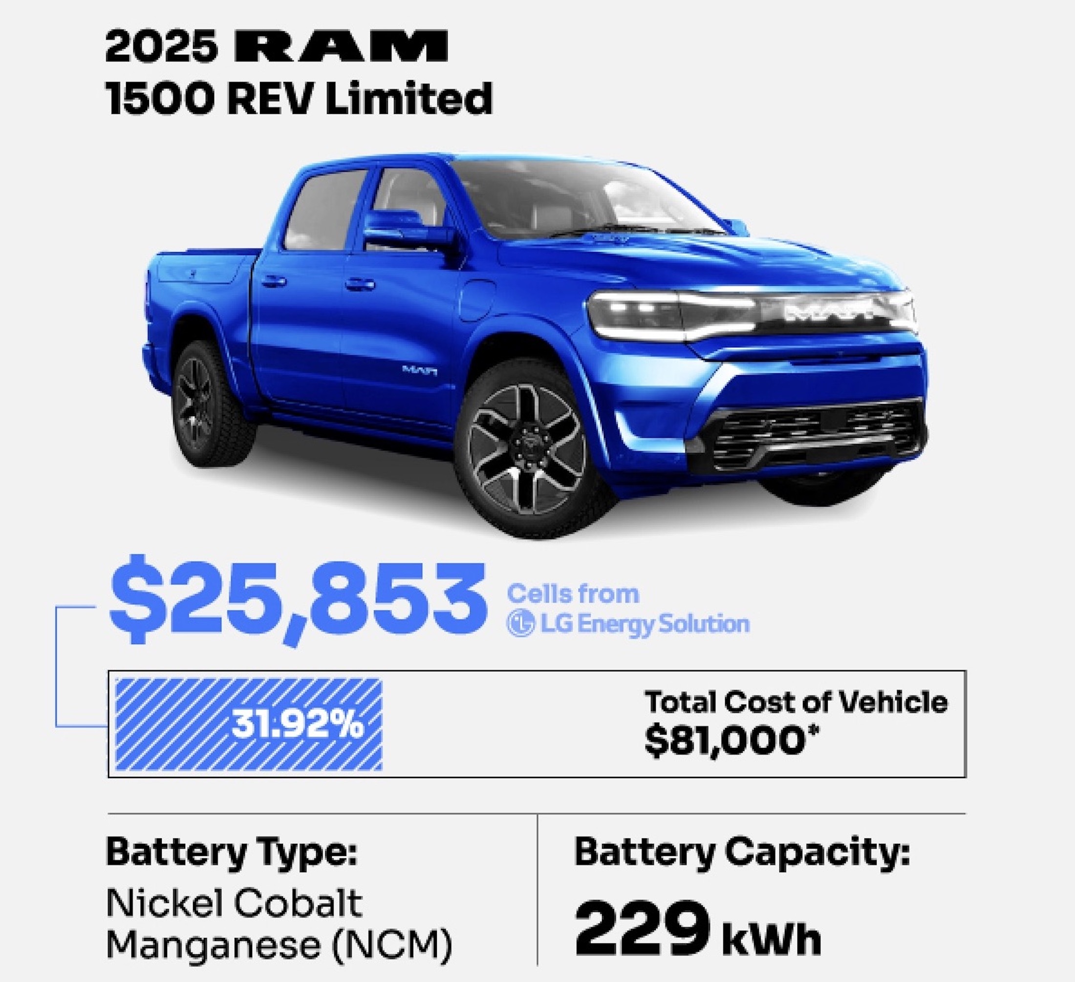 It also claims that replacing the Ford Mustang Mach E’s LPF battery would set you back a more bearable $6,895, or 16 percent of the total vehicle price, and that the Cadillac Escalade IQ’s 200 kWh battery, while expensive at $22,540, only makes up 17.3 percent of the SUV’s price. We can’t know how accurate all of this data is, but if the figures are close to realistic it tells us that Ram’s profit margins must be slim, and that anyone buying a used Ram 1500 REV years down the line wants to hope they don’t ever need a new battery.
