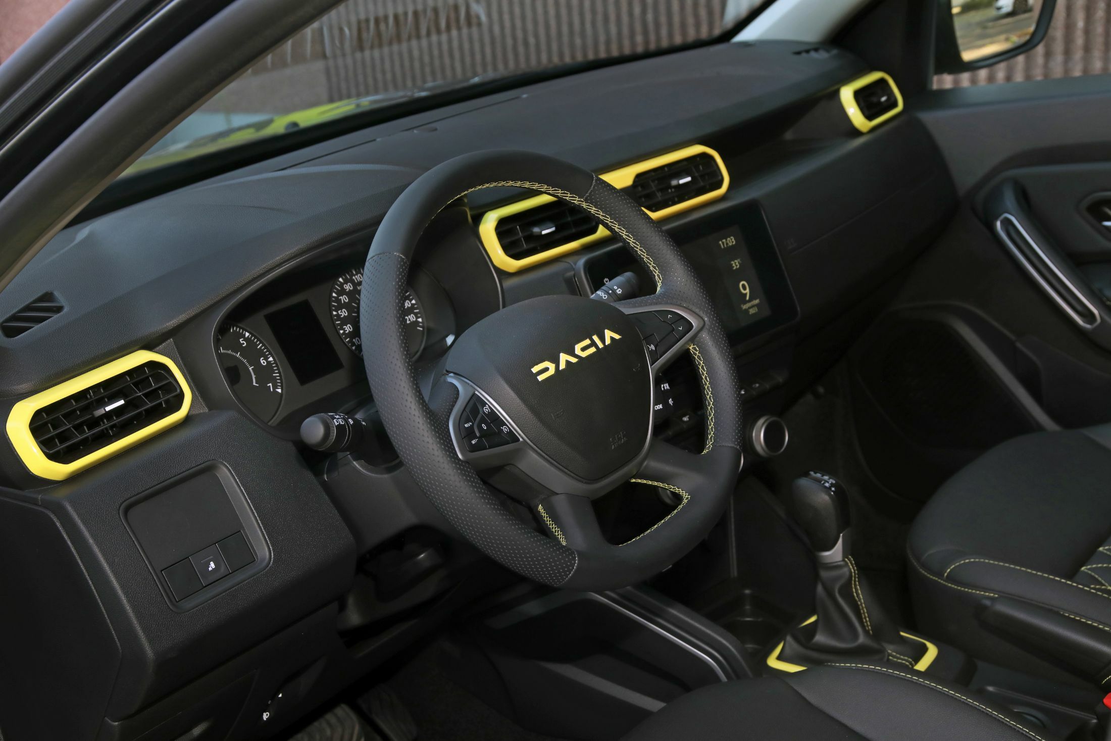 Moving inside, the company opted for a high-contrast color combination with yellow accents and stitching on a black background. The Dacia fabric has been replaced by high-quality leather upholstery for a more premium feel although the hard scratchy plastics remain. The seats have a Bentley-style quilted pattern and a Carpoint Edition emblem embroidered on the seatbacks. Similar emblems can be found on the floor mats and the yellow-painted side sills.