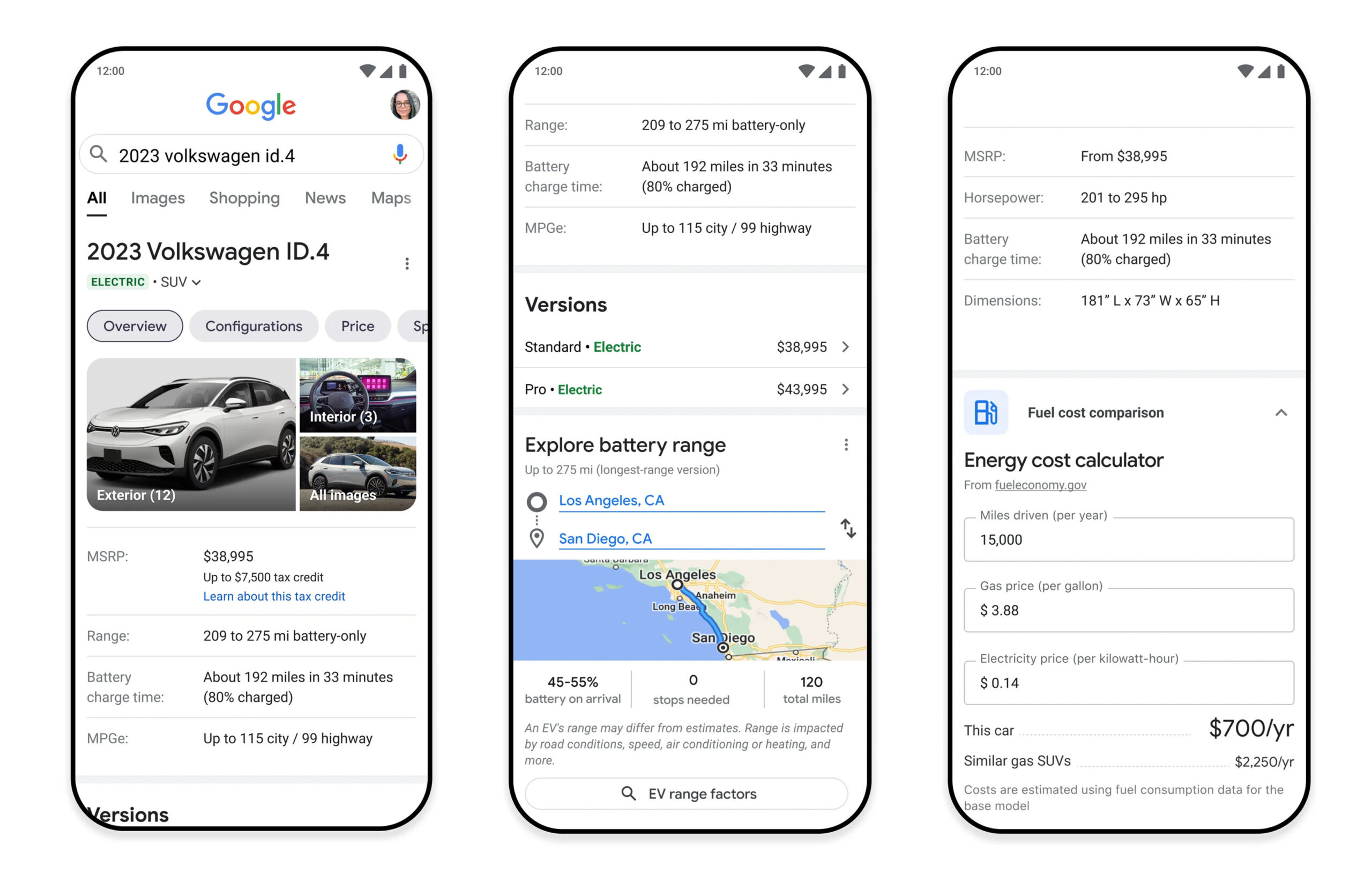 In addition, buyers can check out how much it’ll cost to charge an electric vehicle and then compare that to what it would cost to fuel up a combustion-powered car. Those same features are coming to countries abroad in the near future too. Google also has a new tool to help buyers check out range estimates based on their specific local driving route.
