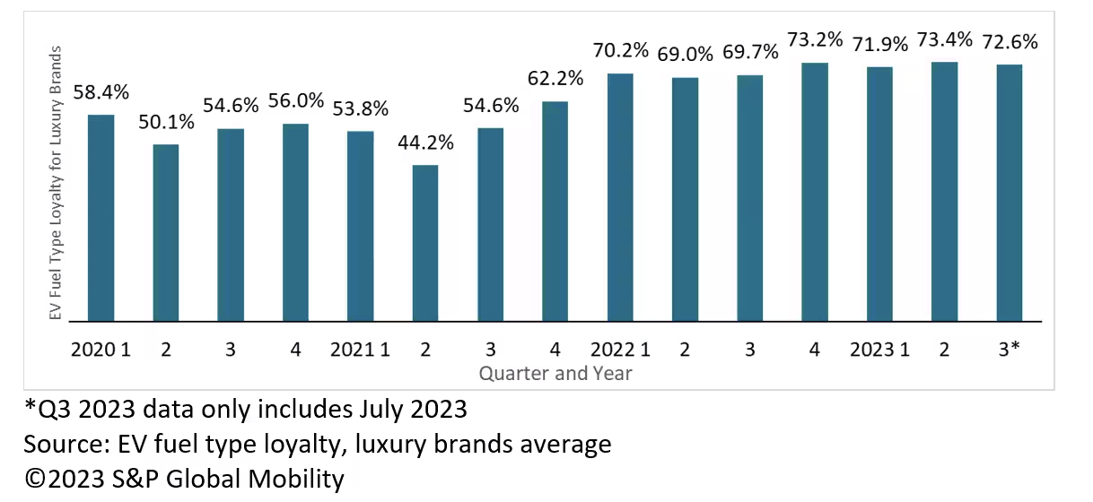 Data also reveals that 60.7% of Chevrolet Bolt owners jump into another EV as their next car and those didn’t typically opt for a Chevrolet SUV or truck. EV loyalty rates among luxury vehicle buyers have jumped significantly over the past three years, nearing or sometimes even eclipsing the 60% mark.
