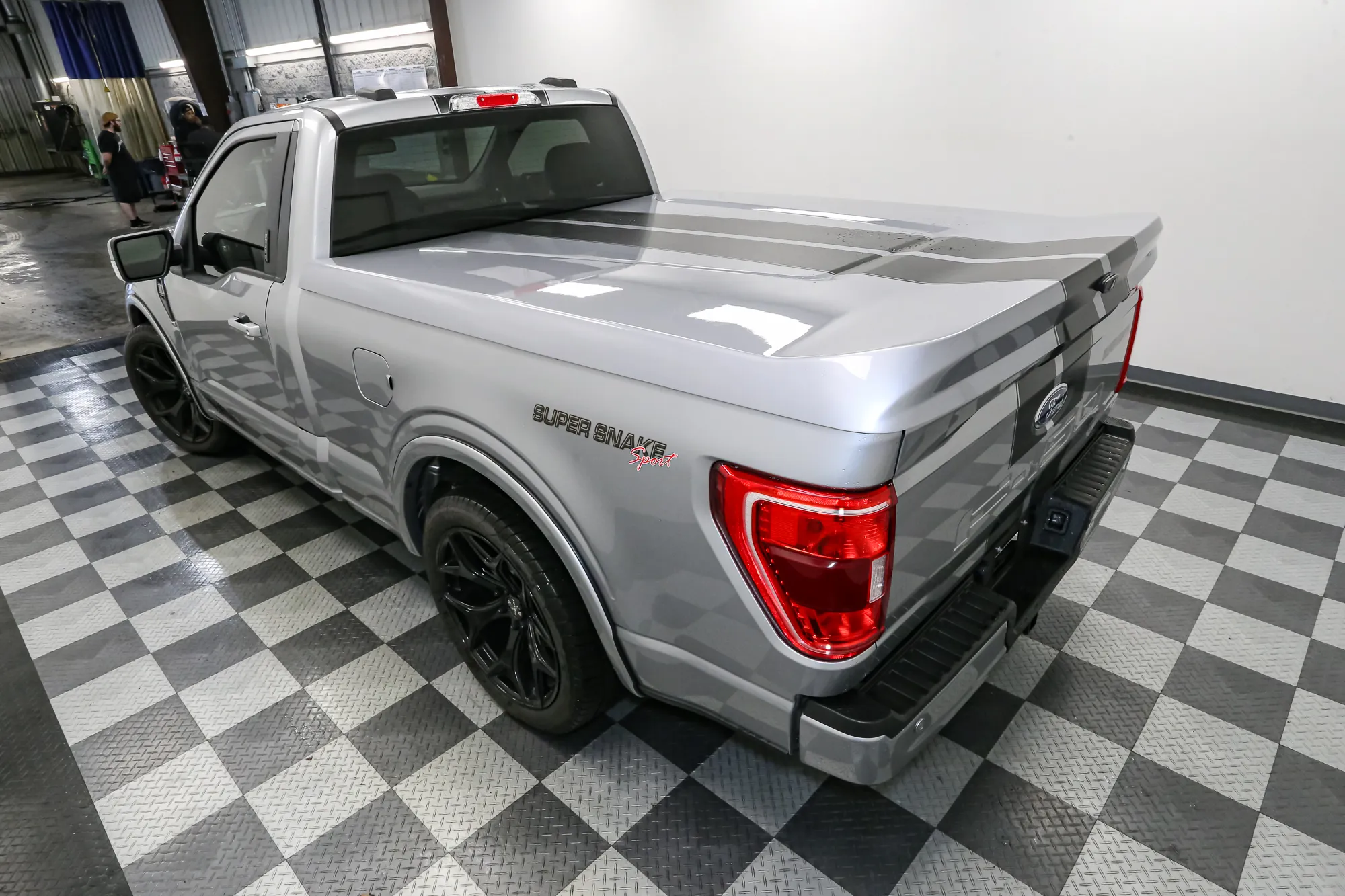 Numerous visual changes have also been made. For example, the F-150 Super Snake includes an overhauled front fascia with a new hood rocking ram-air intakes, a bold bumper, and a splitter. The car also sits on 22-inch forged wheels wrapped in 305/40 Michelin Defender LTX M/S tires. Lowered RideTech suspension with adjustable Fox front coilovers and new rear shocks have also been installed. For a car as powerful as this it is only fitting that six-piston Baer brake calipers are located up front alongside updated rear brake calipers.