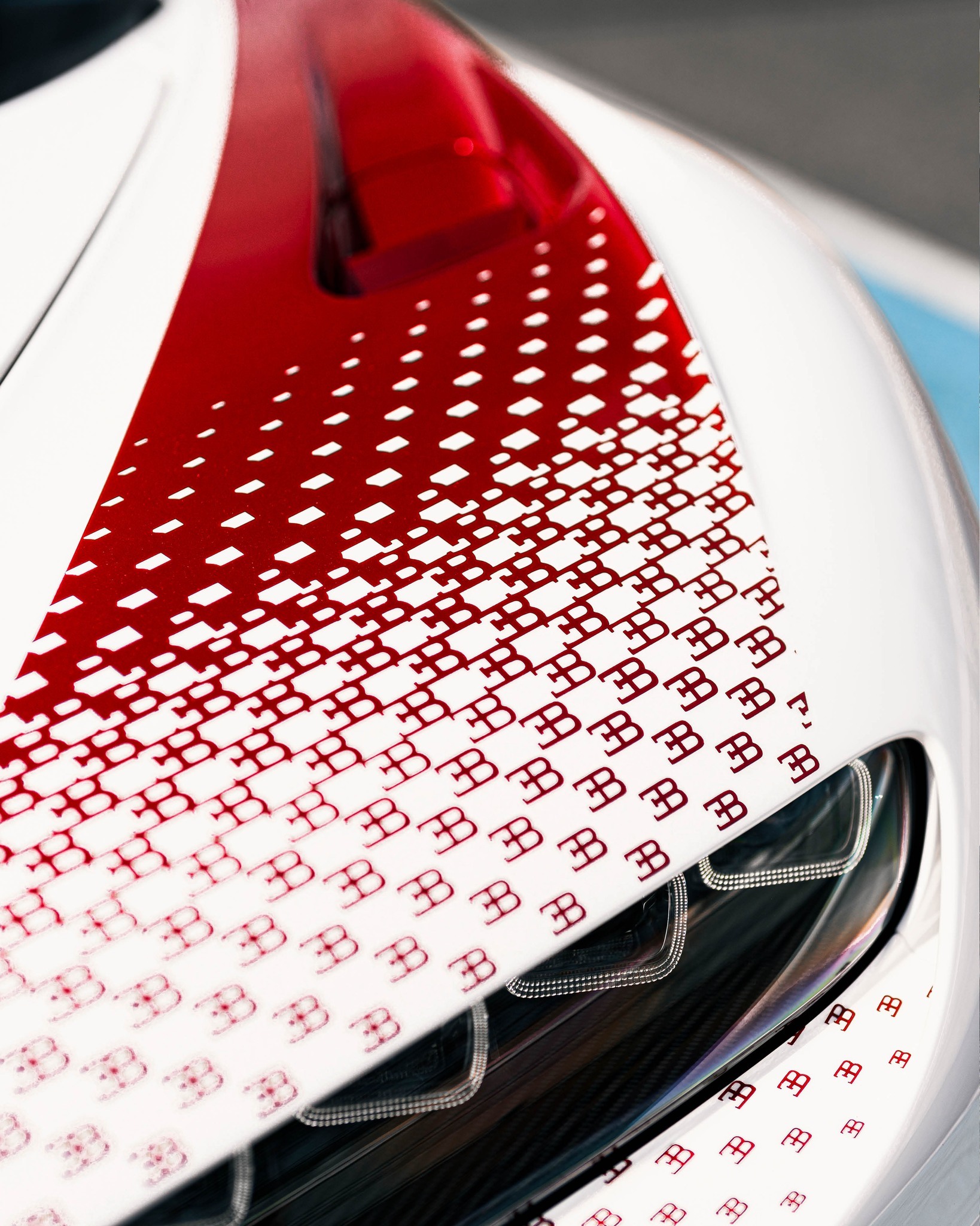 These red elements are most apparent across the front fenders of the French hypercar with racing stripes made up of dozens of little Bugatti logos. Red is also found on the hand-painted ‘32’ lettering on the doors which pays tribute to the Bugatti Type 51 that claimed victory at the 1931 French Grand Prix while driven by Louis Chiron and Achille Varzi. The rear wing of the car also has red Bugatti lettering.