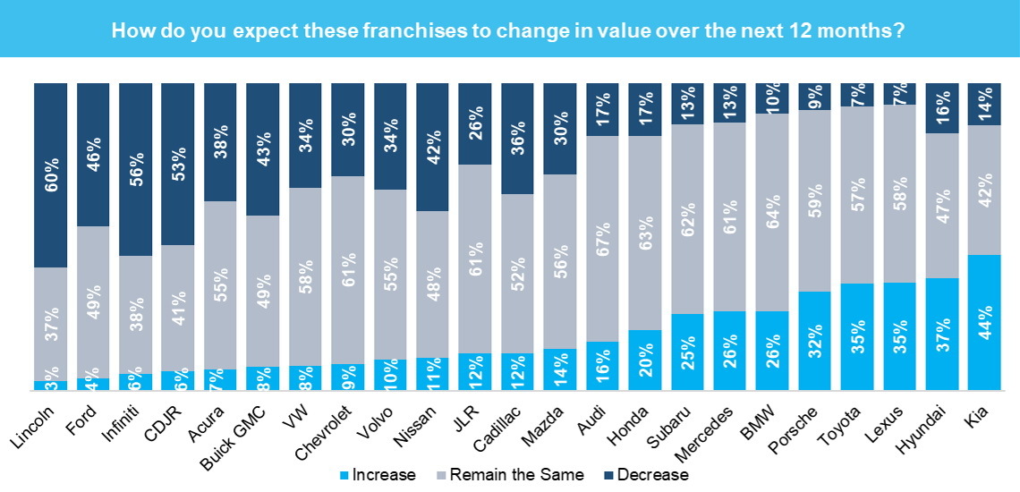 The automotive brands dealers expect to gain the most are Kia, Hyundai, Lexus, Toyota, and Porsche, reports Kerrigan. In fact, 44 percent of dealers expected the valuation of Kia dealerships to increase, which is twice the industry average.