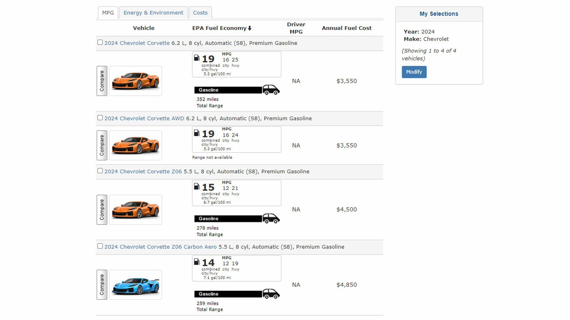 The same can’t be said about fuel economy ratings as they’re bogus. The city numbers are fine, but the highway figures are wrong at both the high and low end. The EPA lists the 2024 Corvette Stingray as getting 25 mpg highway, which is 1 mpg more than what the AI says. The ‘ghost writer’ also forgot about the Corvette Z06 with the Carbon Aero Package, which is rated at 19 mpg highway and not the 21 mpg listed. It’s also wrong about combined fuel economy as the car actually returns between 14 and 19 mpg, not “15 to 16 mpg.”