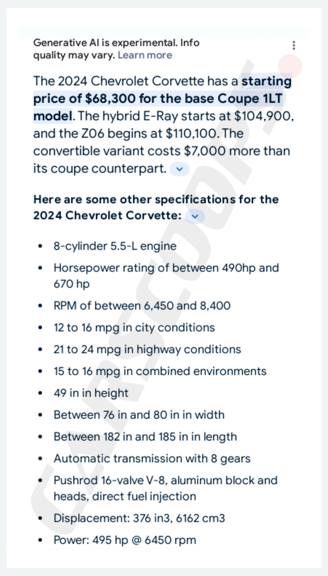 More alarmingly, Google didn’t seem to notice or care about the mistakes. Instead, the company was focused on the wording and tone of “starting price of $68,300 for the base Coupe 1LT model.” It’s a little janky and humans would probably rewrite the sentence to say, “The 2024 Chevrolet Corvette Stingray 1LT Coupe has a starting price of $68,300.”