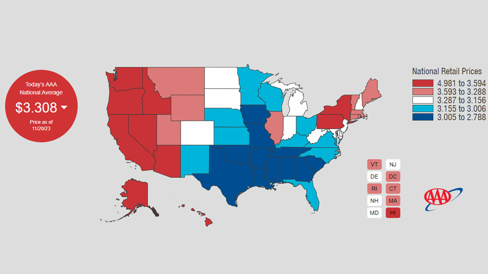 On the bright side, the national average price for a gallon of gasoline has fallen to $3.31. That’s down from $3.58 per gallon last year, so drivers should be thankful for lower prices at the pump.
