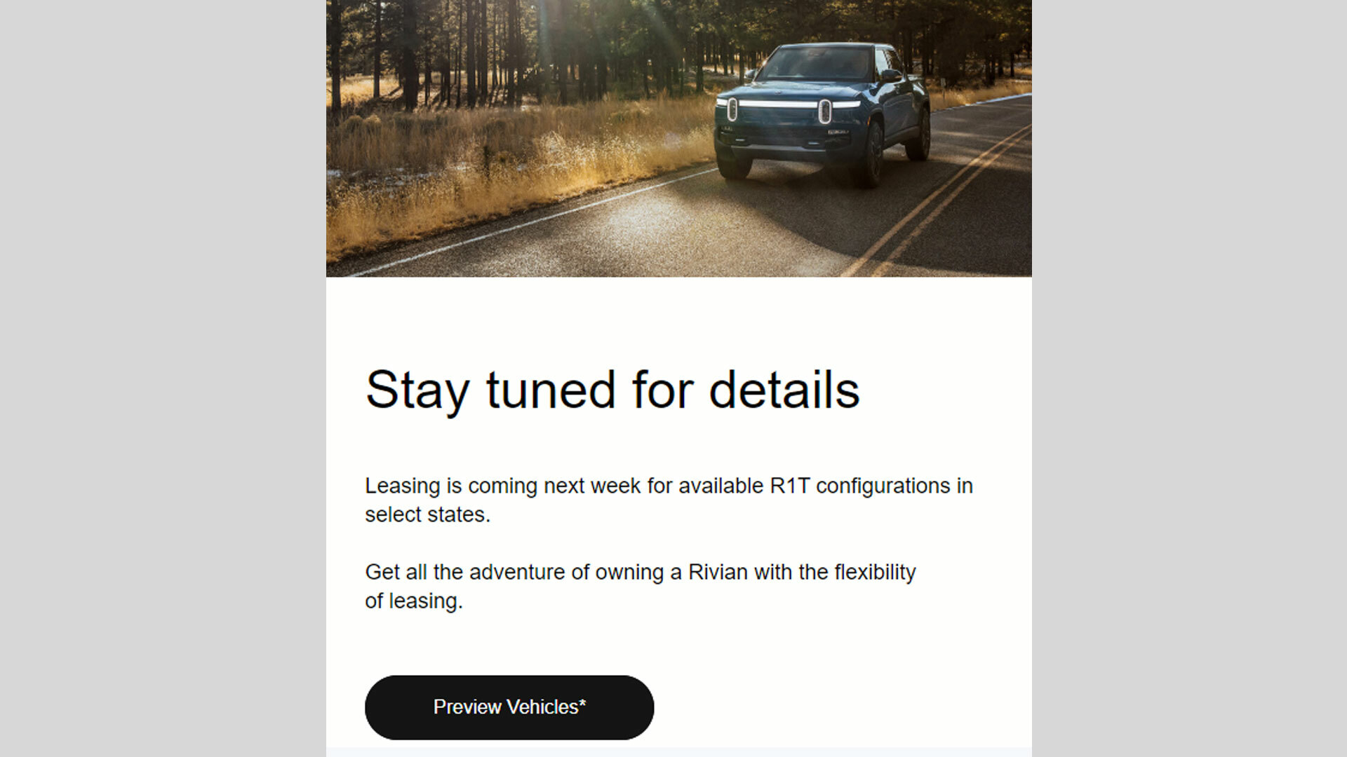 Details are limited, but the automaker sent out an e-mail saying “leasing is coming next week for available R1T configurations in select states.” The company went on to say would-be buyers can “get all the adventure of owning a Rivian with the flexibility of leasing.”