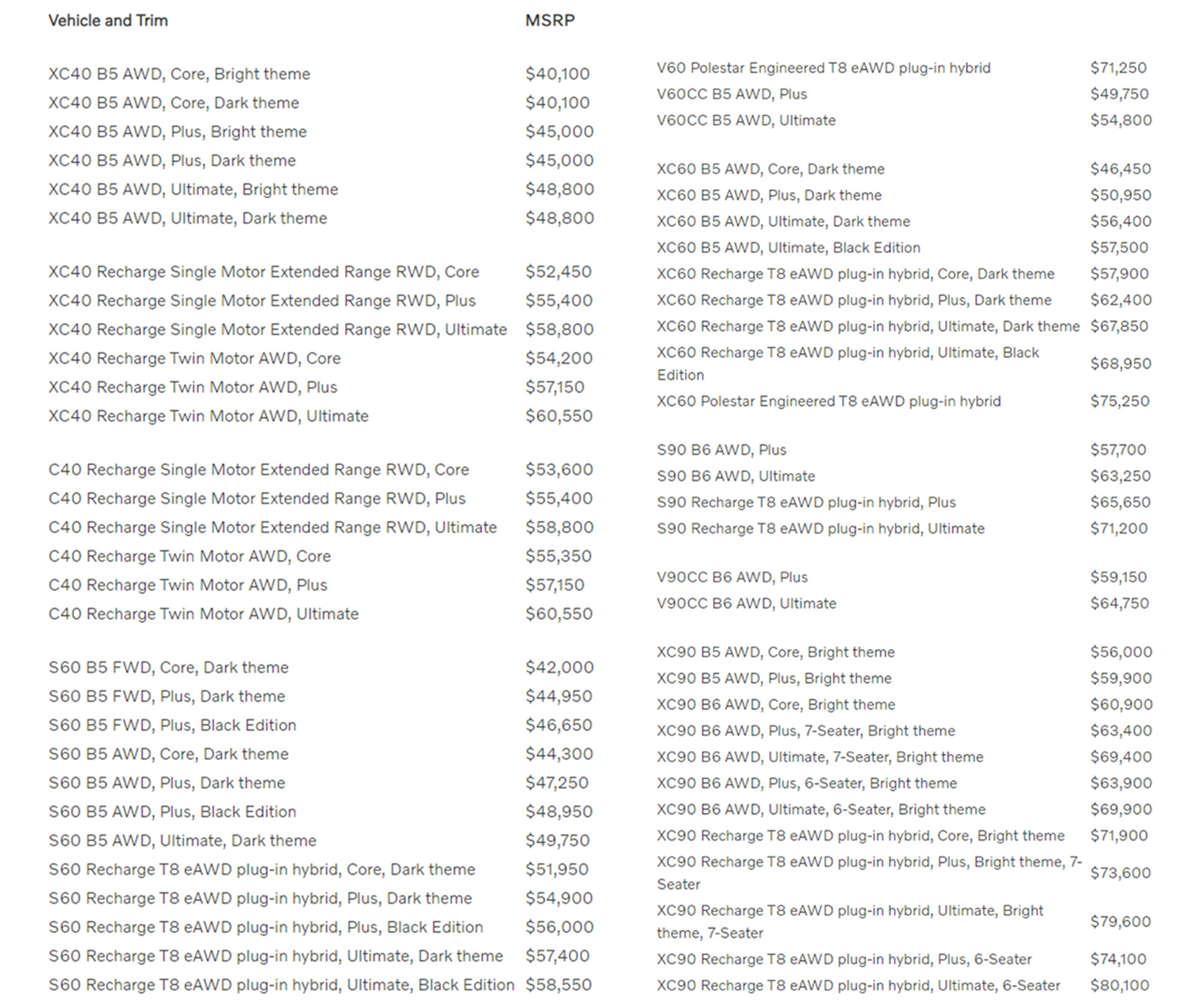 The rest of the 2024 model year range remains familiar. Volvo’s most affordable model in the U.S. is the XC40 B5 AWD which starts at $40,100 and the combustion XC40 range tops out at $48,800. Those wanting a sedan can pick up the S60 for between $42,000 and $58,550 or the S90 from $57,700 to $71,200 while the V60 is offered for as little as $54,800 and as much as $71,250. Other models include the XC60 priced between $46,450 and $75,520, the V90 Cross Country available from $59,150 and topping out at $64,750, and the XC90 priced from $56,000 and topping out at $80,100.