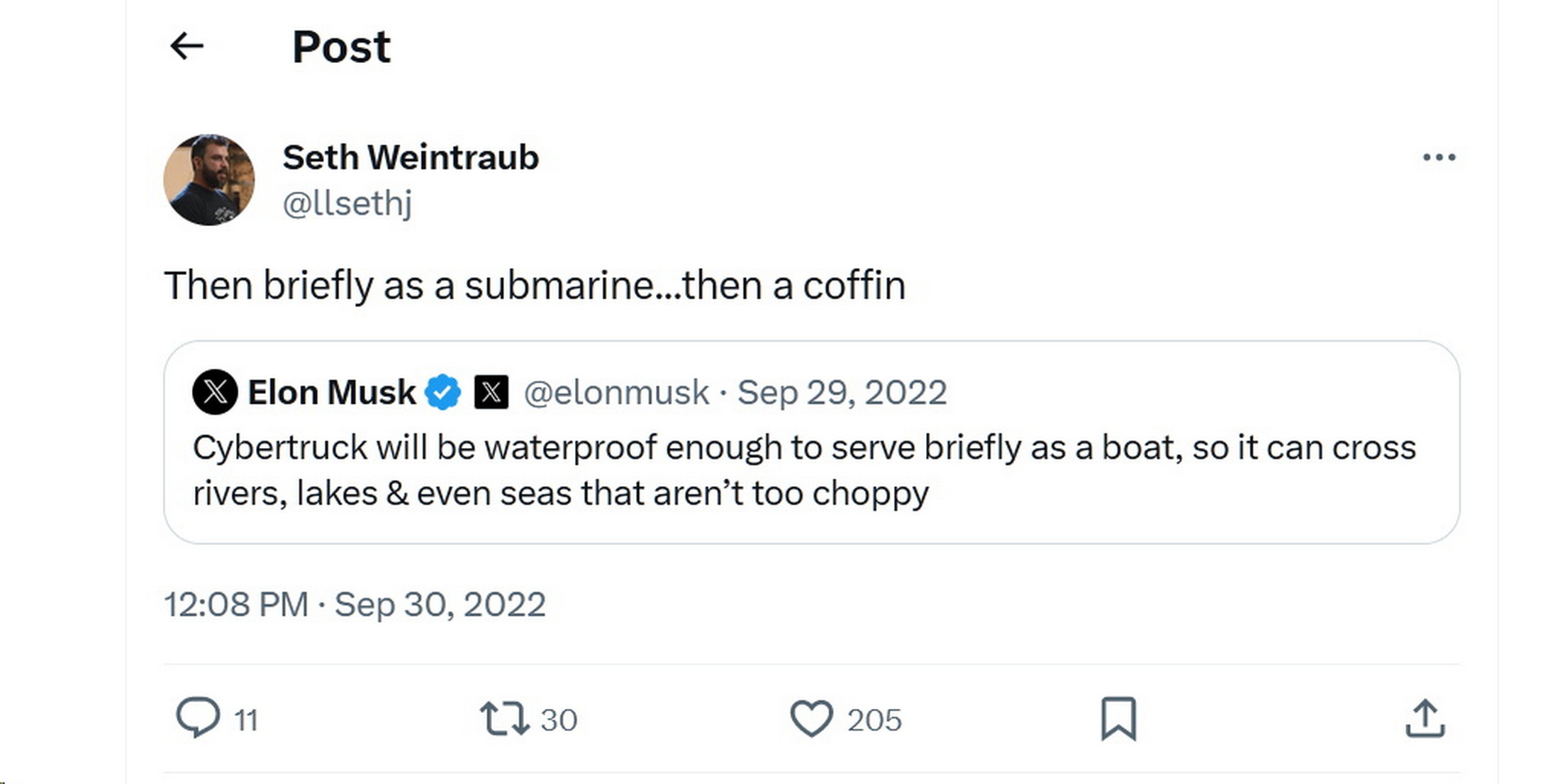 If I could editorialize a bit here, it’s not that turning the Cybertruck into a watercraft is impossible — cars that become boats have been made before. I don’t think Musk’s idea is particularly dangerous, it’s just not very good. I could teach my dog to hit each key on a typewriter, but it would take a lot of time and effort, and in the end he still wouldn’t be able to spell.