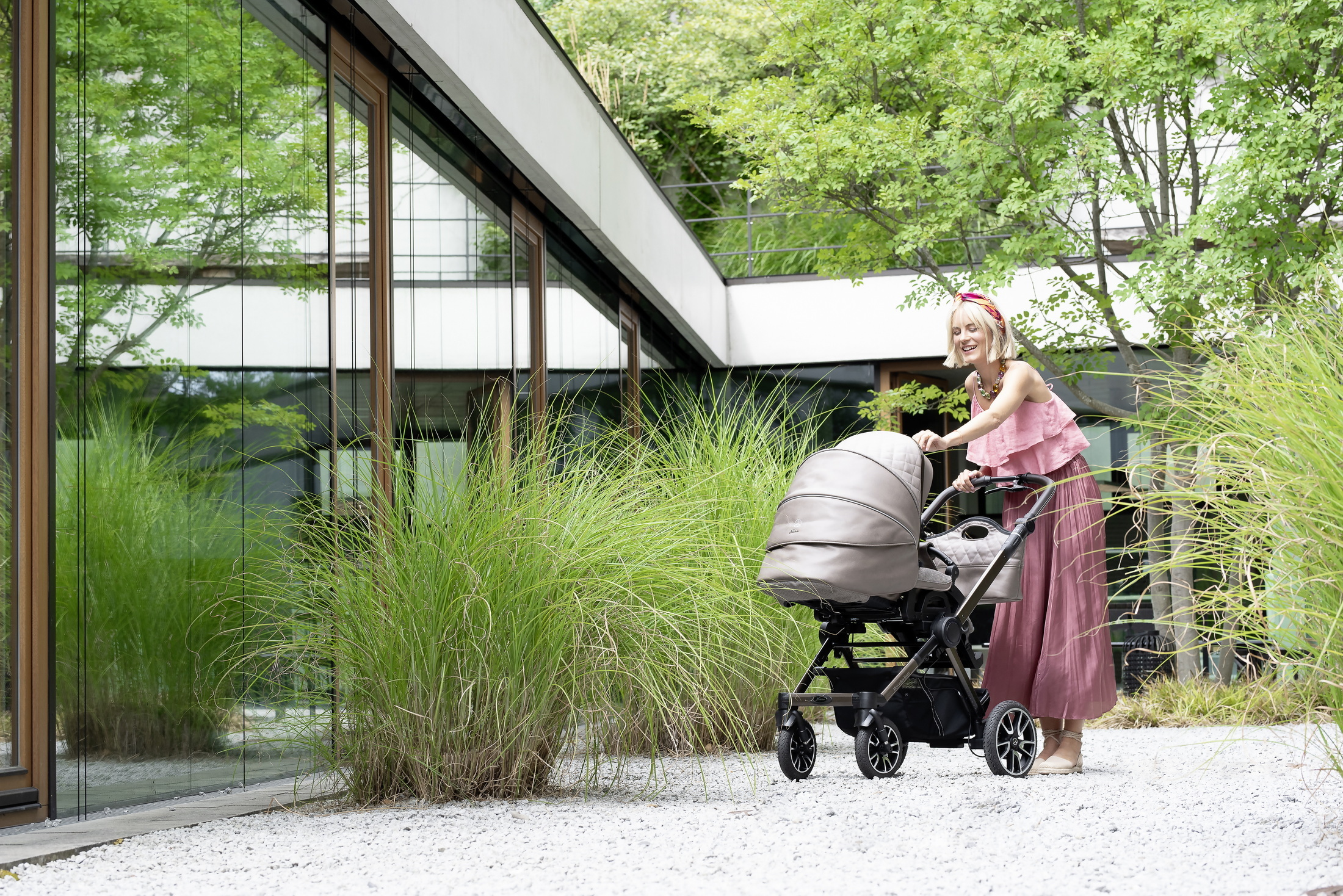 A swiveling handle allows passengers to face their guardian or to face the world ahead. Adjustable suspension and air chamber tires allow it tackles most surfaces, while the brake can be operated directly, or via a switch on the handle for added safety. As with the other two models that preceded it, the Performance model is available in five colors: rubellit, opalith, denim blue, tartufo, and sage gray.