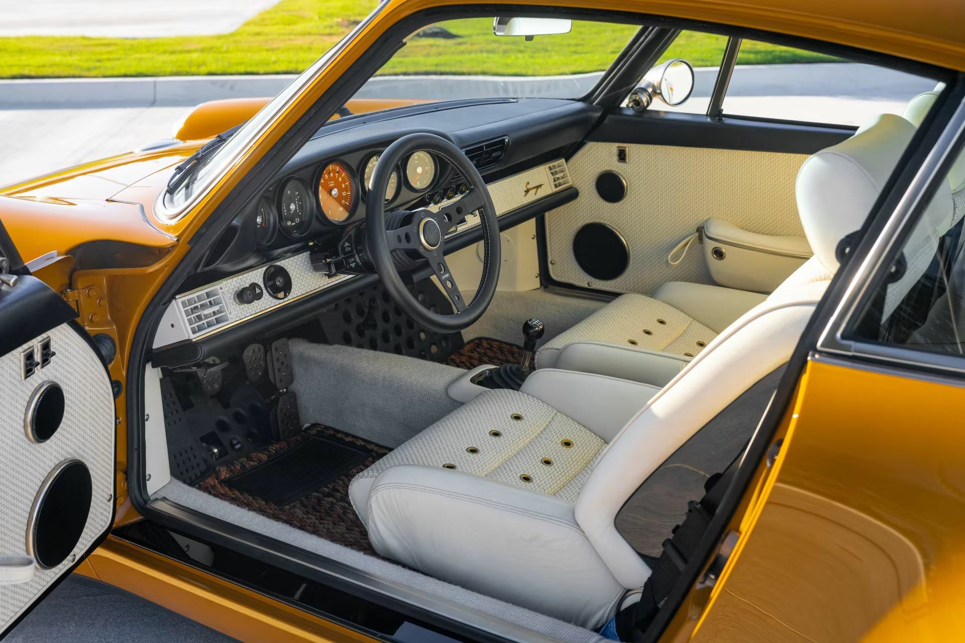 This particular 911 is a 1991 Carrera 2 Coupe that has benefitted from the full suite of Singer upgrades. The special touches start with the paint which is dubbed Namibia Yellow which comes complete with ghosted stripes and brown ‘Porsche’ lettering. Like other Singer projects, the fenders, bumpers, hood, rear decklid, and roof are all made from lightweight carbon fiber and the original owner opted for the available fuel filler cap in the center of the hood.