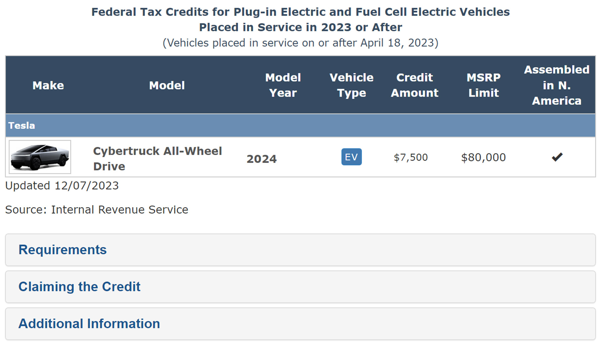 The website for the Internal Revenue Service (IRS) was recently updated to include the new Cybertruck All-Wheel Drive and also temporarily listed the Cybertruck tri-motor ‘Cyberbeast’ as being eligible for the tax credit if placed in service before December 31, 2023. The website since appears to have been updated to no longer include the Cyberbeast as it starts at $99,990, well over the $80,000 cap on vehicles that are eligible for the credit.