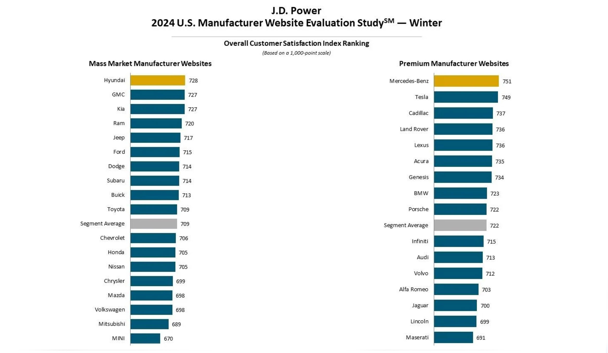 J.D. Power’s semiannual Manufacturer Website Evaluation Study measures customer satisfaction in the US, by examining four key measures – information/content, visual appeal, navigation, and speed. The results are based on responses from 12,481 individuals who will be in the market for a new vehicle sometime in the next 24 months. The latest Winter 2024 study took place between October and December 2023.