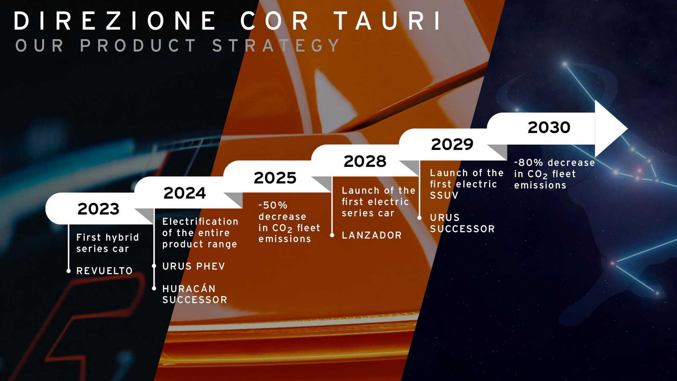 Lamborghini says that the new Huracan successor, in combination with the Revuelto and the Urus PHEV, is part of its “Direzione Cor Tauri” plan to reduce emissions. It hopes to halve the CO2 output of its range by 2025 and to further reduce it by 80 percent by 2030.