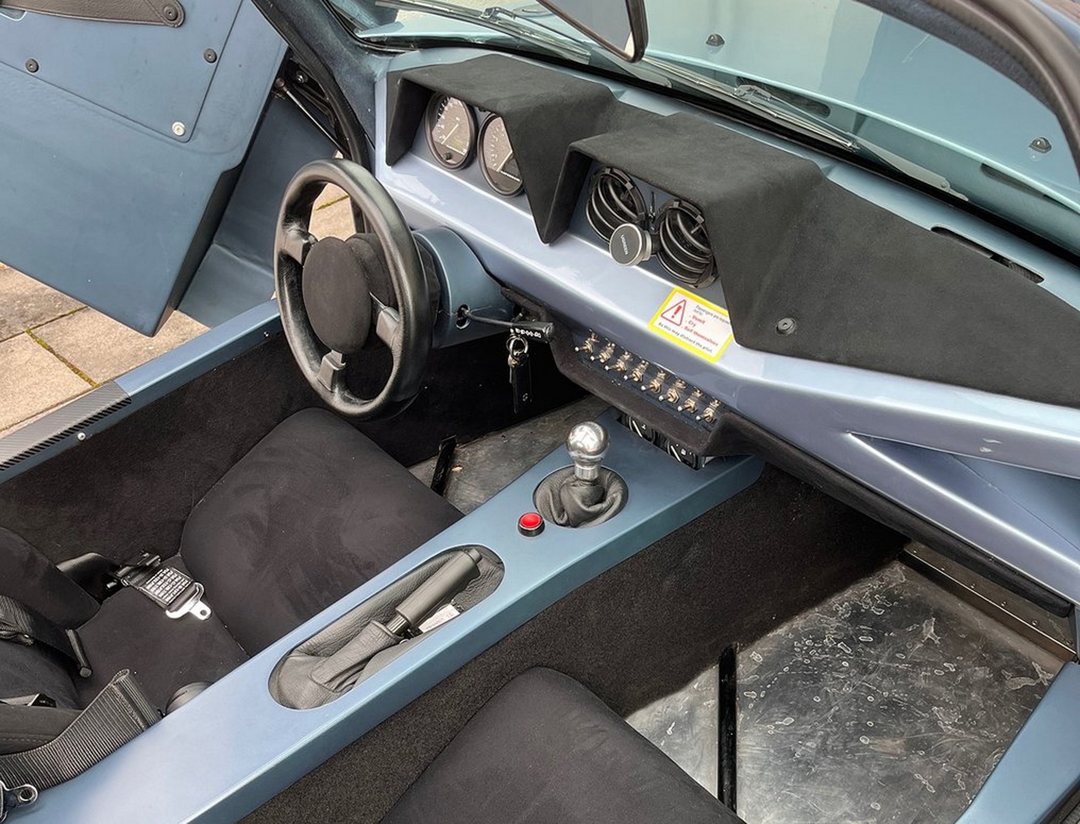 While the donor car came with exposed wheels, half-doors, and no roof, the CSR 200 GT has a fully closed body and huge butterfly doors. The doors open up together with sections of the roof, allowing easier access to the cramped two-seater cabin.