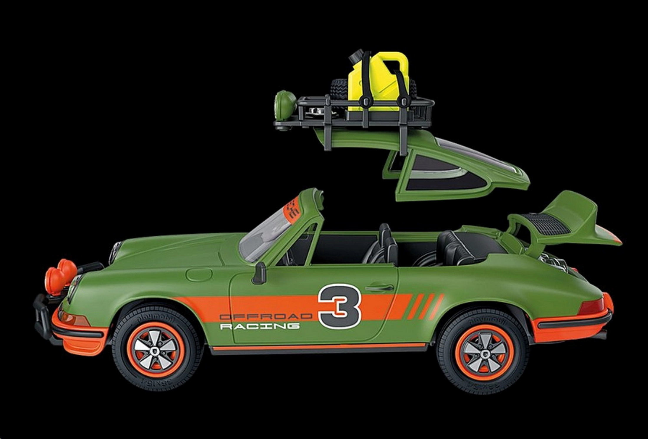 That roof rack contains a spare tire and a gas can, both of which are held in place with silicon straps. In addition, the set comes with a rock pile, a shovel, and a recovery board to help extricate the Porsche if it gets bogged down in the soft stuff.