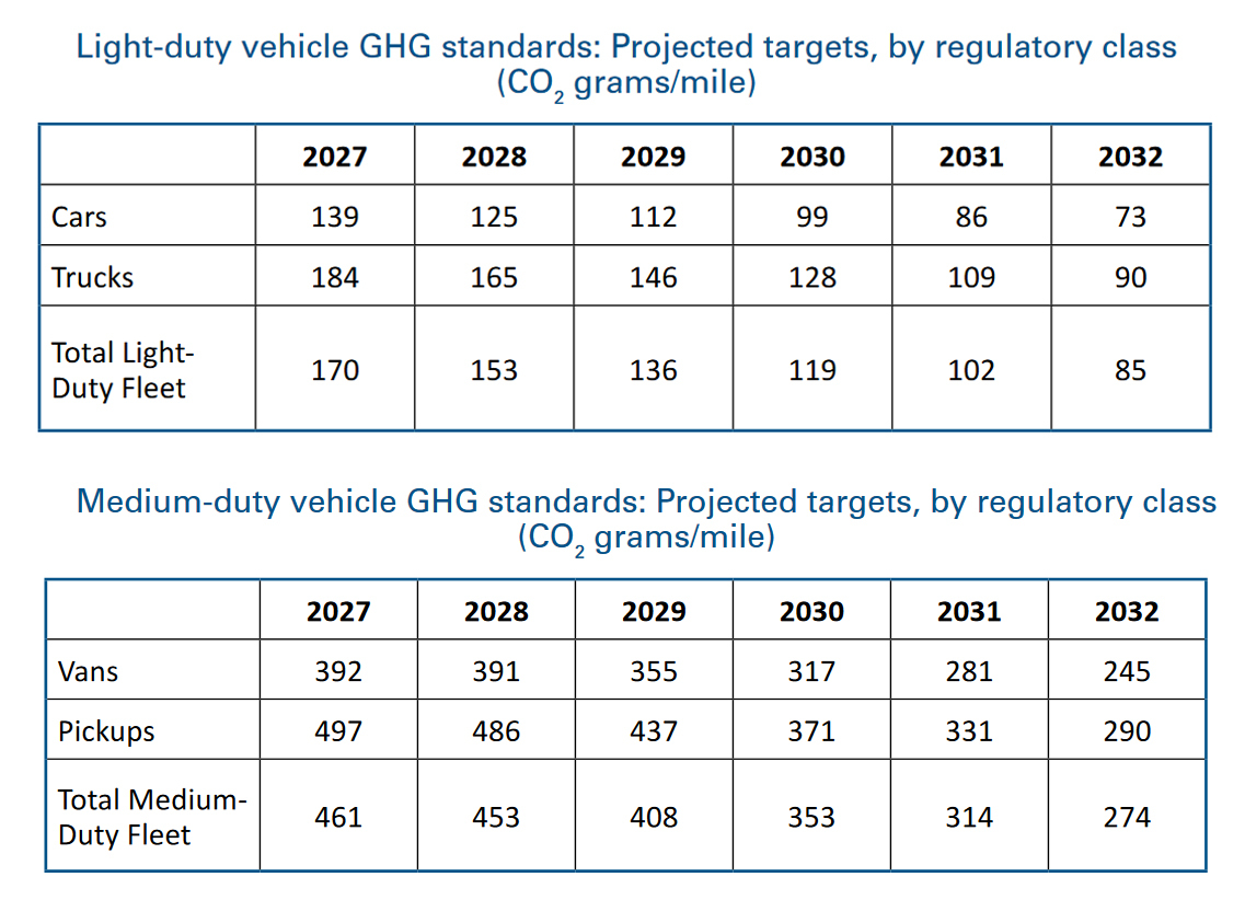 The rules do not impose a mandate on the types of vehicles automakers can produce and sell. However, the EPA is targeting an industry-wide average of just 85 grams of CO2 per mile for light-duty vehicles (i.e., passenger vehicles) by model year 2032. For medium-duty vehicles (small commercial vehicles), it aims for a reduction of approximately 44 percent, to 274 grams of CO2 per mile.