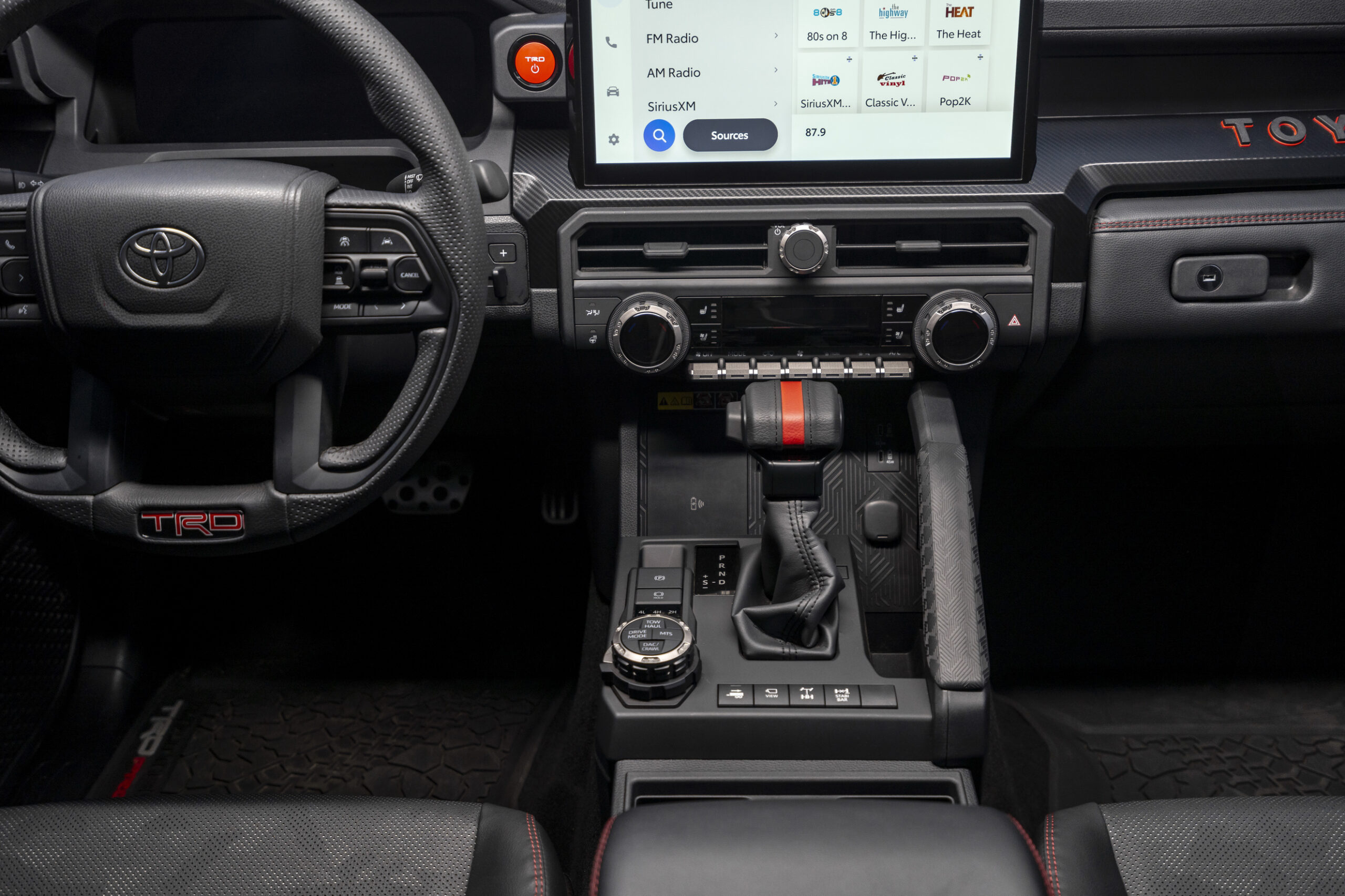 The interiors of the 4Runner and Tacoma bear striking similarities. In fact, their center tunnel sections share the same layout, featuring matching cargo storage compartments and grab handles. Both vehicles sport identical infotainment systems, cupholders, and cargo spaces. From the driver’s seat, distinguishing between the two models would be challenging if not for the graphics on the dashboard.